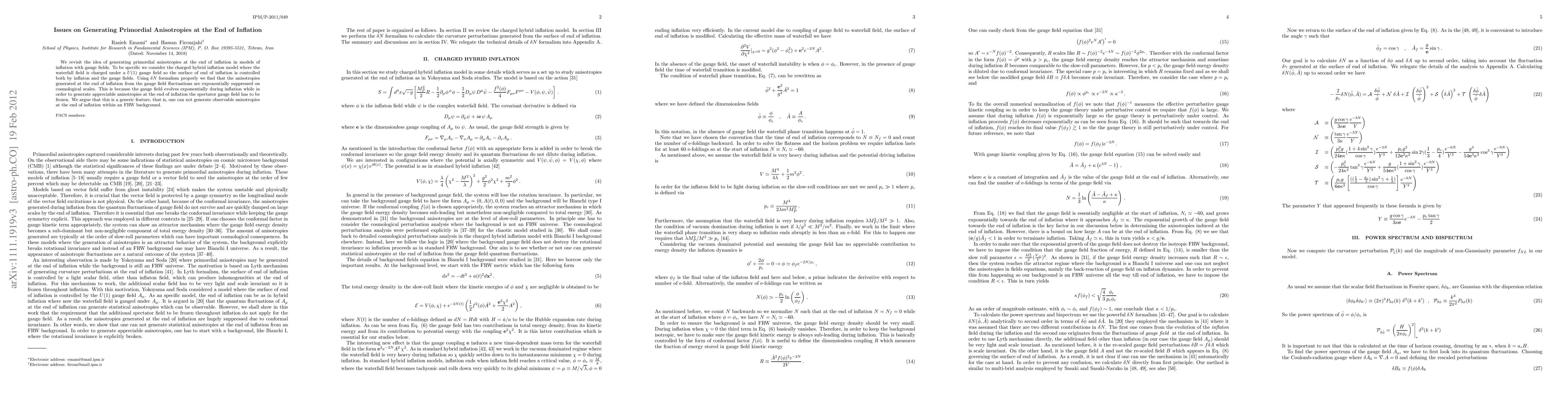 This paper explores the generation of primordial anisotropies at the end of inflation in charged hybrid inflation models, finding that gauge field fluctuations are exponentially suppressed due to their evolution during inflation. It concludes that observable anisotropies cannot be generated in such scenarios within a Friedmann-Robertson-Walker background.