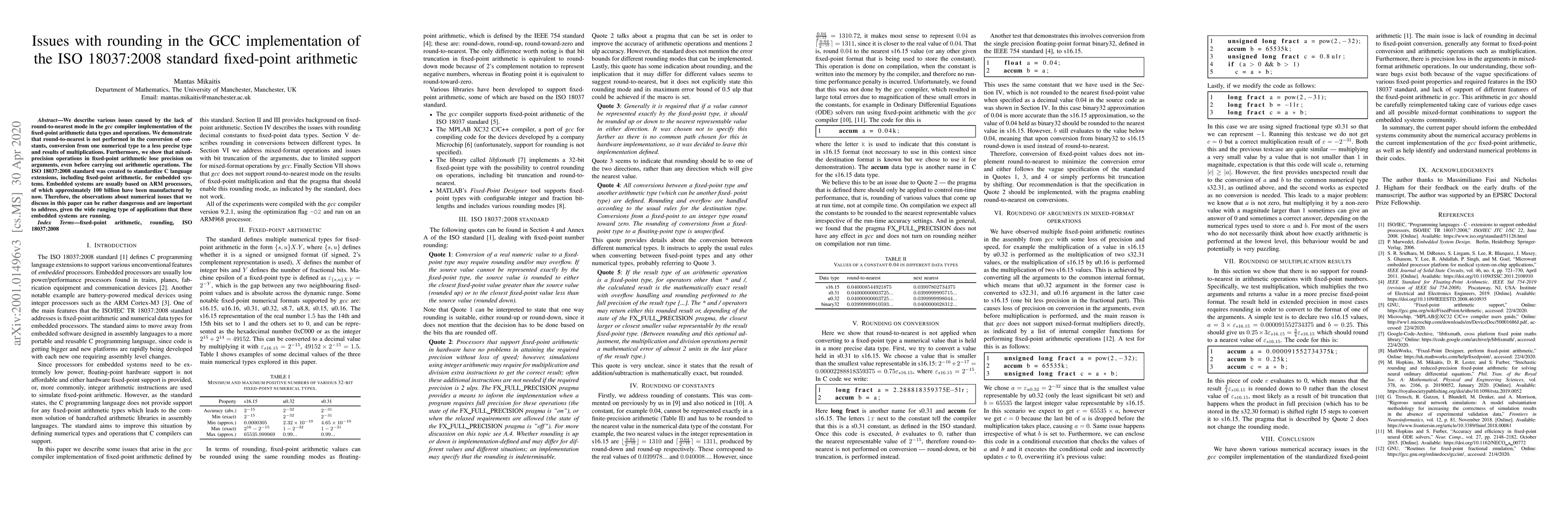 We describe various issues caused by the lack of round-to-nearest mode in the \textit{gcc} compiler implementation of the fixed-point arithmetic data types and operations. We demonstrate that round-to-nearest is not performed in the conversion of constants, conversion from one numerical type to a less precise type and results of multiplications. Furthermore, we show that mixed-precision operations in fixed-point arithmetic lose precision on arguments, even before carrying out arithmetic operations. The ISO 18037:2008 standard was created to standardize C language extensions, including fixed-point arithmetic, for embedded systems. Embedded systems are usually based on ARM processors, of which approximately 100 billion have been manufactured by now. Therefore, the observations about numerical issues that we discuss in this paper can be rather dangerous and are important to address, given the wide ranging type of applications that these embedded systems are running.