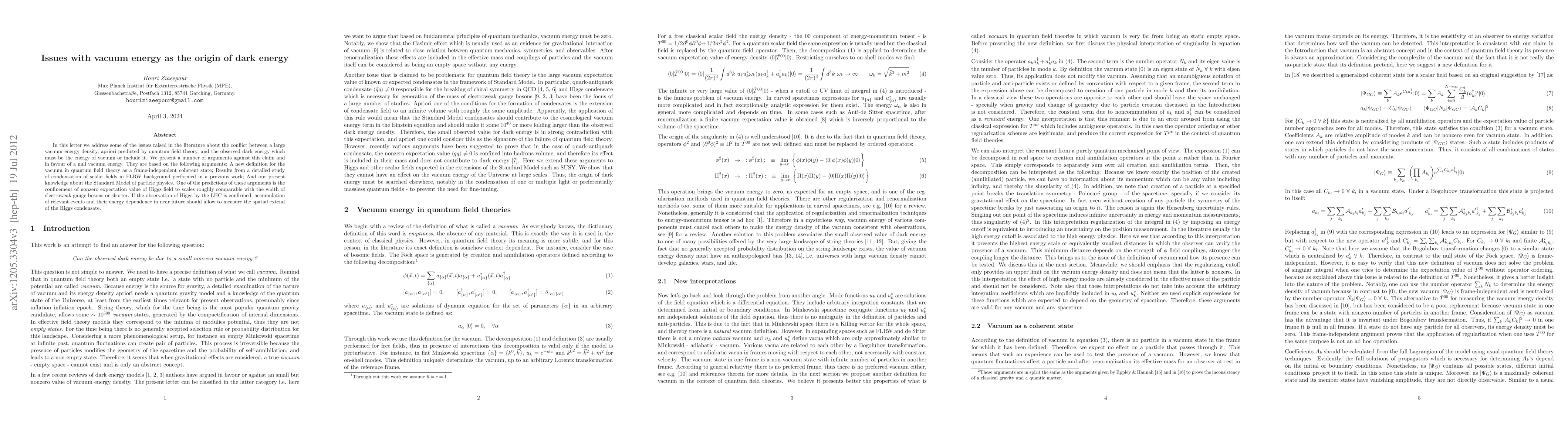 In this letter we address some of the issues raised in the literature about the conflict between a large vacuum energy density, apriori predicted by quantum field theory, and the observed dark energy which must be the energy of vacuum or include it. We present a number of arguments against this claim and in favour of a null vacuum energy. They are based on the following arguments: A new definition for the vacuum in quantum field theory as a frame-independent coherent state; Results from a detailed study of condensation of scalar fields in FLRW background performed in a previous work; And our present knowledge about the Standard Model of particle physics. One of the predictions of these arguments is the confinement of nonzero expectation value of Higgs field to scales roughly comparable with the width of electroweak gauge bosons or shorter. If the observation of Higgs by the LHC is confirmed, accumulation of relevant events and their energy dependence in near future should allow to measure the spatial extend of the Higgs condensate.