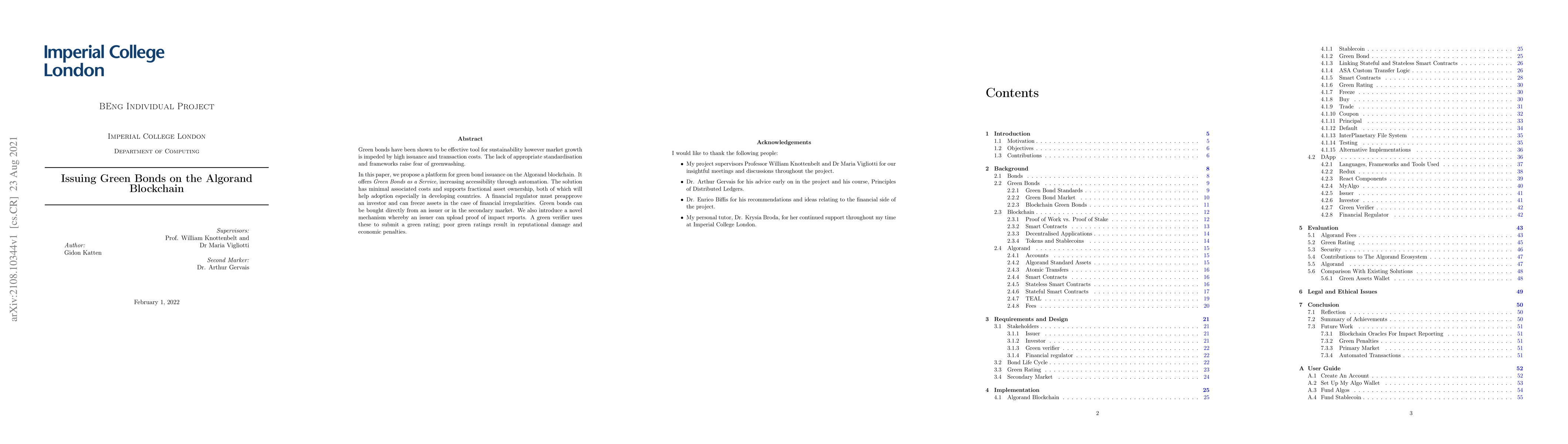 This paper proposes a platform for green bond issuance on the Algorand blockchain to reduce costs and standardize processes, enhancing accessibility and combating greenwashing through automated issuance and fractional ownership. The platform includes a regulatory mechanism and a novel impact reporting system to ensure transparency and accountability.