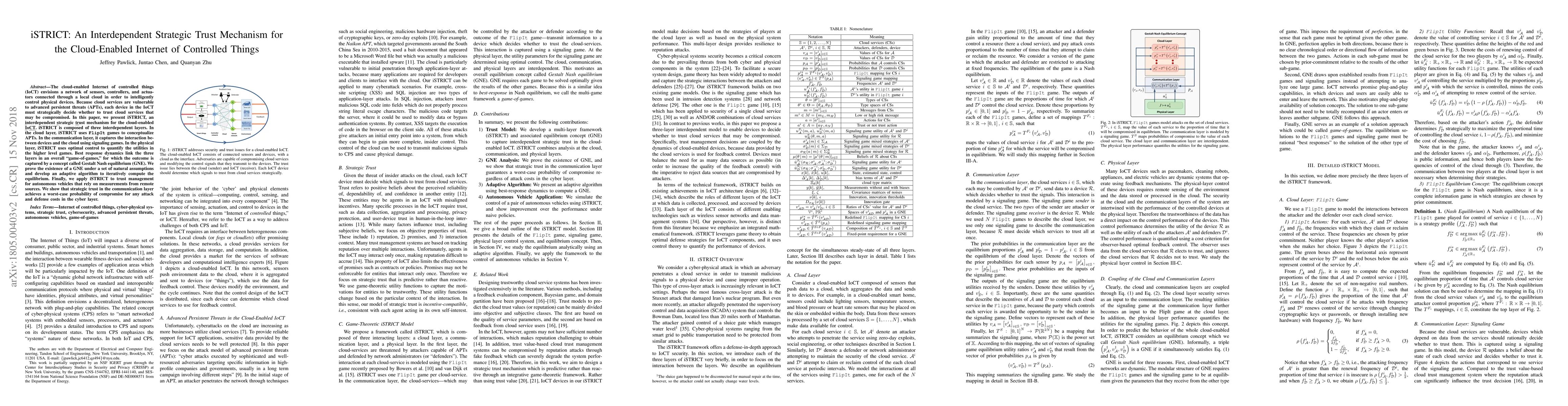 iSTRICT is an interdependent strategic trust mechanism for cloud-enabled Internet of controlled things (IoCT), employing FlipIt games, signaling games, and optimal control to manage trust across three layers. The mechanism achieves a Gestalt Nash equilibrium to optimize trust decisions, demonstrated effectively in autonomous vehicle trust management.