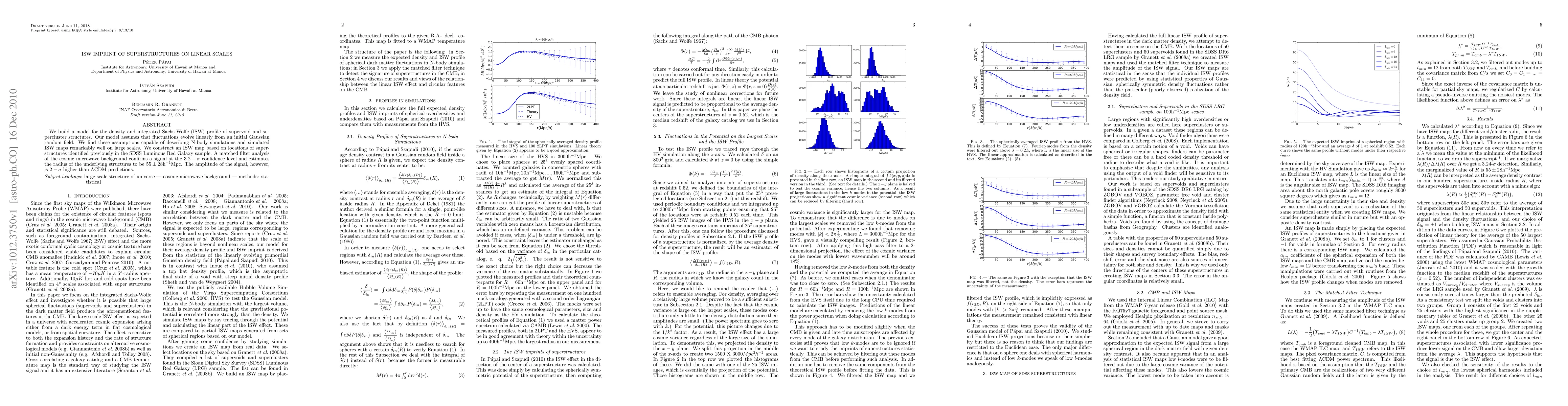 We build a model for the density and integrated Sachs-Wolfe (ISW) profile of supervoid and supercluster structures. Our model assumes that fluctuations evolve linearly from an initial Gaussian random field. We find these assumptions capable of describing N-body simulations and simulated ISW maps remarkably well on large scales. We construct an ISW map based on locations of superstructures identified previously in the SDSS Luminous Red Galaxy sample. A matched filter analysis of the cosmic microwave background confirms a signal at the $3.2-\sigma$ confidence level and estimates the radius of the underlying structures to be $55 \pm 28 ~h^{-1}$Mpc. The amplitude of the signal, however, is $2-\sigma$ higher than $\Lambda$CDM predictions.