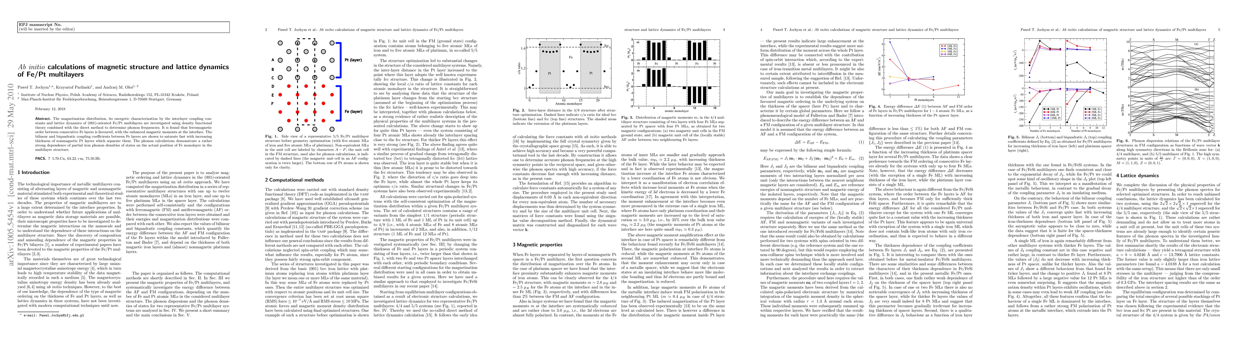 Researchers used density functional theory to study Fe/Pt multilayers, finding that ferromagnetic order is favored with enhanced magnetic moments at the interface. The structure's properties depend on the position of the iron monolayer in the multilayer.