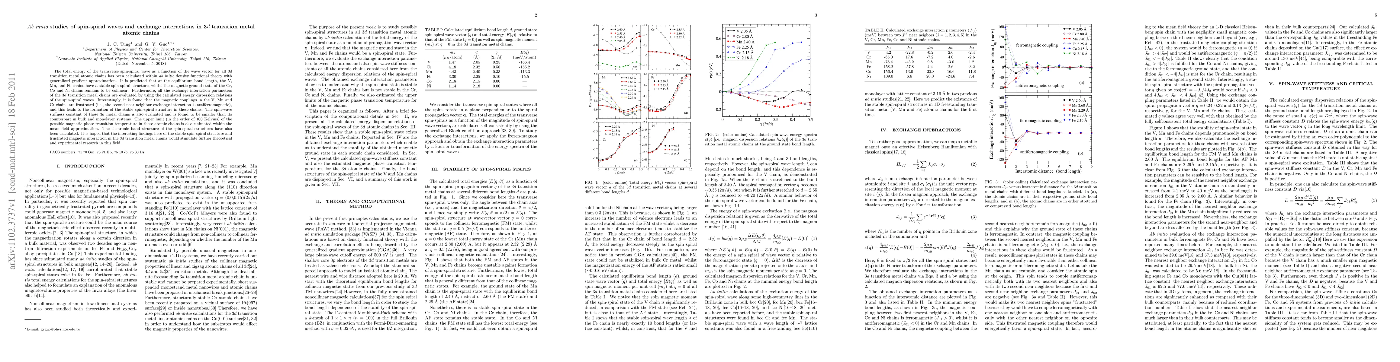 The total energy of the transverse spin-spiral wave as a function of the wave vector for all 3$d$ transition metal atomic chains has been calculated within {\it ab initio} density functional theory with generalized gradient approximation. It is predicted that at the equilibrium bond length, the V, Mn, and Fe chains have a stable spin spiral structure, whilst the magnetic ground state of the Cr, Co and Ni chains remains to be collinear. Furthermore, all the exchange interaction parameters of the 3$d$ transition metal chains are evaluated by using the calculated energy dispersion relations of the spin-spiral waves. Interestingly, it is found that the magnetic couplings in the V, Mn and Cr chains are frustrated (i.e., the second near neighbor exchange interaction is antiferromagnetic), and this leads to the formation of the stable spin-spiral structure in these chains. The spin-wave stiffness constant of these 3$d$ metal chains is also evaluated and is found to be smaller than its counterpart in bulk and monolayer systems. The upper limit (in the order of 100 Kelvins) of the possible magnetic phase transition temperature in these atomic chains is also estimated within the mean field approximation. The electronic band structure of the spin-spiral structures have also been calculated. It is hoped that the interesting findings here of the stable spin-spiral structure and frustrated magnetic interaction in the 3$d$ transition metal chains would stimulate further theoretical and experimental research in this field.