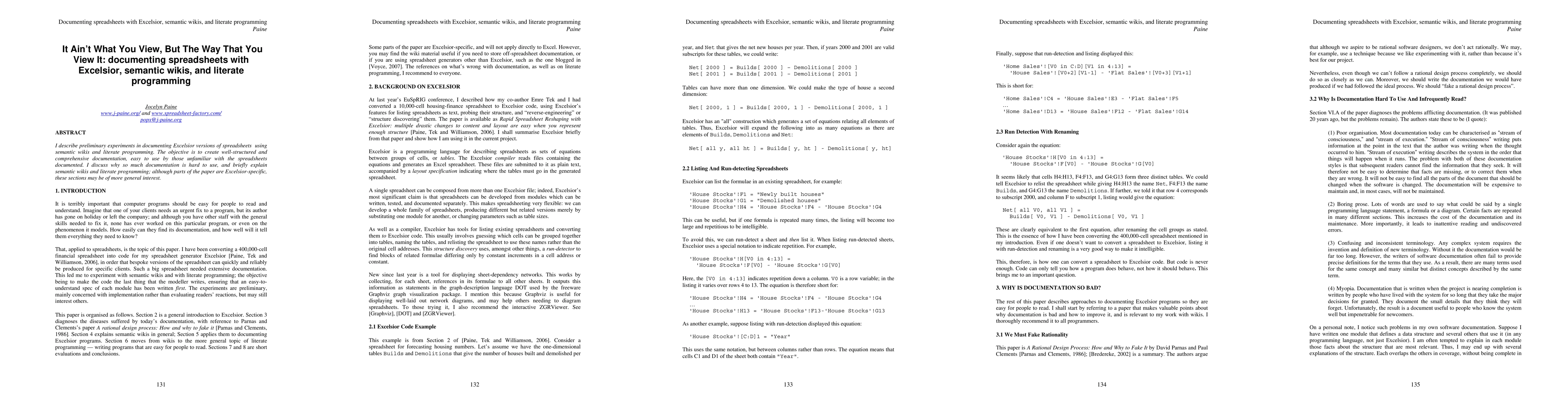 This paper explores documenting Excelsior spreadsheets using semantic wikis and literate programming to create clear, user-friendly documentation. It highlights the challenges in existing documentation and offers insights into how these methods can improve documentation accessibility for non-experts.