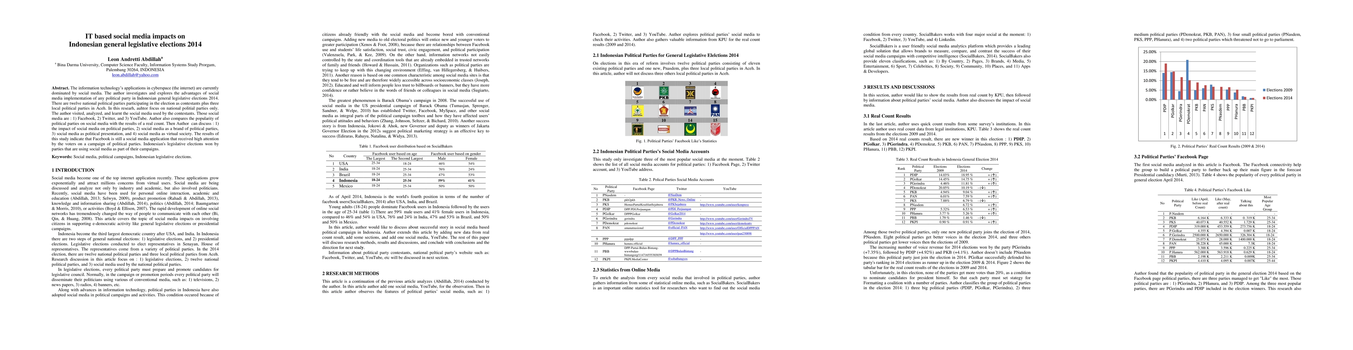 The information technology applications in cyberspace (the internet) are currently dominated by social media. The author investigates and explores the advantages of social media implementation of any political party in Indonesian general legislative elections 2014. There are twelve national political parties participating in the election as contestants plus three local political parties in Aceh. In this research, author focus on national political parties only. The author visited, analyzed, and learnt the social media used by the contestants. Those social media are : 1) Facebook, 2) Twitter, and 3) YouTube. Author also compares the popularity of political parties on social media with the results of a real count. Then Author can discuss : 1) the impact of social media on political parties, 2) social media as a brand of political parties, 3) social media as political presentation, and 4) social media as virtual society. The results of this study indicate that Facebook is still a social media application that received high attention by the voters on a campaign of political parties. Indonesian's legislative elections won by parties that are using social media as part of their campaigns.