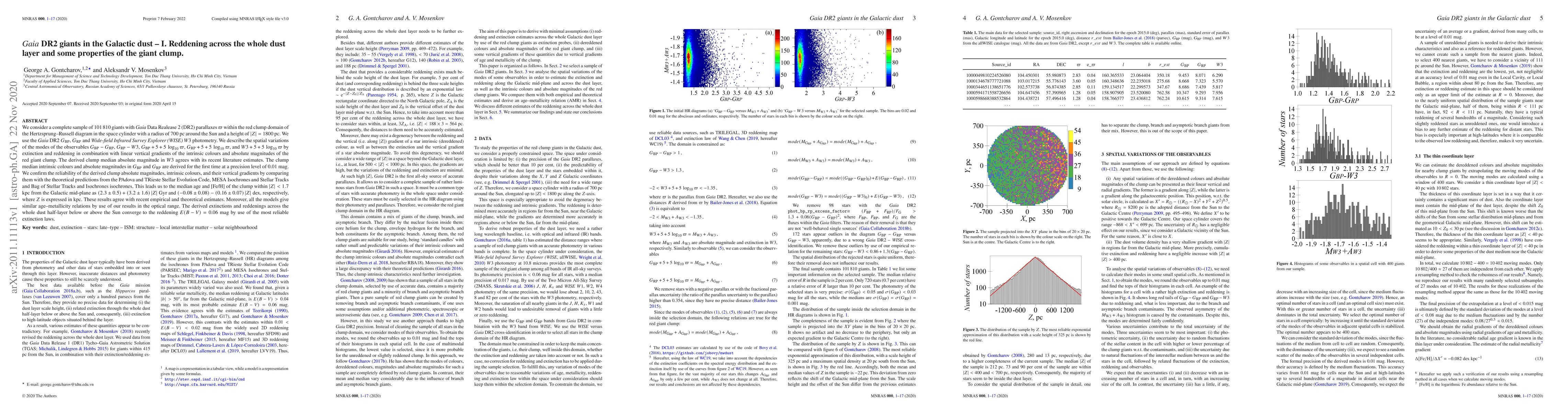 We consider a complete sample of 101810 giants with Gaia DR2 parallaxes $\varpi$ within the red clump domain of the Hertzsprung-Russell diagram in the space cylinder with a radius of 700 pc around the Sun and a height of $|Z|=1800$ pc. We use the Gaia DR2 $G_\mathrm{BP}$, $G_\mathrm{RP}$ and WISE $W3$ photometry. We describe the spatial variations of the modes of the observables $G_\mathrm{BP}-G_\mathrm{RP}$, $G_\mathrm{RP}-W3$, $G_\mathrm{BP}+5+5\,\log_{10}\varpi$, $G_\mathrm{RP}+5+5\,\log_{10}\varpi$, and $W3+5+5\,\log_{10}\varpi$ by extinction and reddening in combination with linear vertical gradients of the intrinsic colours and absolute magnitudes of the red giant clump. The derived clump median absolute magnitude in $W3$ agrees with its recent literature estimates. The clump median intrinsic colours and absolute magnitudes in $G_\mathrm{BP}$ and $G_\mathrm{RP}$ are derived for the first time at a precision level of 0.01 mag. We confirm the reliability of the derived clump absolute magnitudes, intrinsic colours, and their vertical gradients by comparing them with the theoretical predictions from PARSEC, MIST and BaSTI isochrones. This leads us to the median age and [Fe/H] of the clump within $|Z|<1.7$ kpc from the Galactic mid-plane as $(2.3\pm0.5)+(3.2\pm1.6)\,|Z|$ Gyr and $(-0.08\pm0.08)-(0.16\pm0.07)\,|Z|$ dex, respectively, where $Z$ is expressed in kpc. These results agree with recent empirical and theoretical estimates. Moreover, all the models give similar age-metallicity relations by use of our results in the optical range. The derived extinctions and reddenings across the whole dust half-layer below or above the Sun converge to the reddening $E(B-V)=0.06$ mag by use of the most reliable extinction laws.
