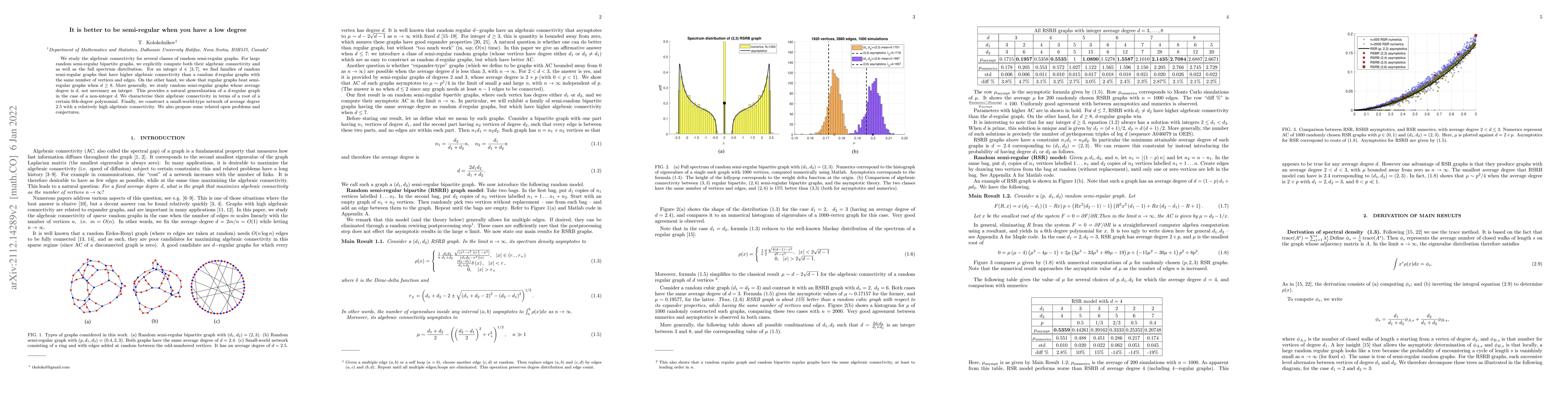 Random semi-regular graphs with low degree have higher algebraic connectivity than their d-regular counterparts for 3 <= d < 8; regular graphs outperform semi-regular graphs for d >= 8.