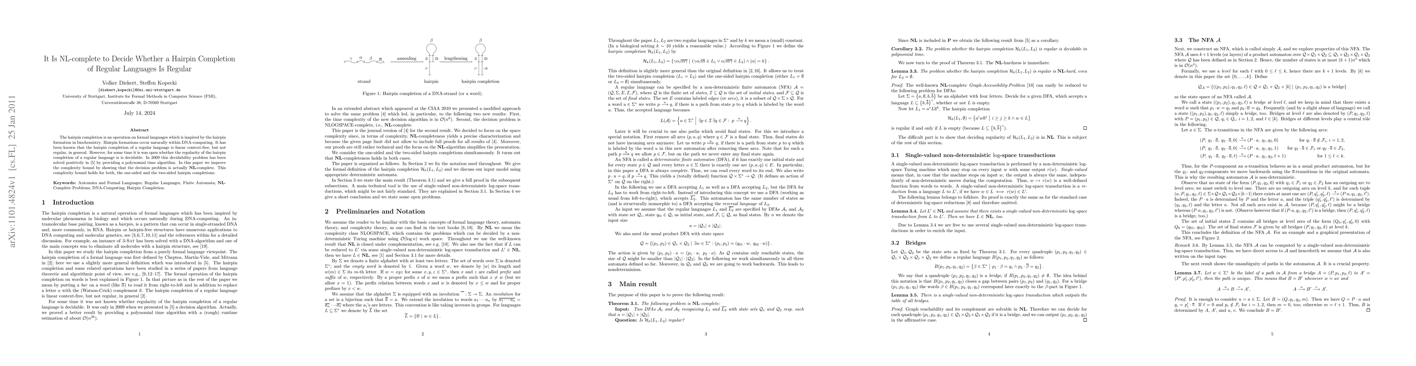 Researchers have proven that it is NL-complete to determine if a regular language's hairpin completion is regular, improving upon an existing polynomial-time algorithm for the decidability problem.