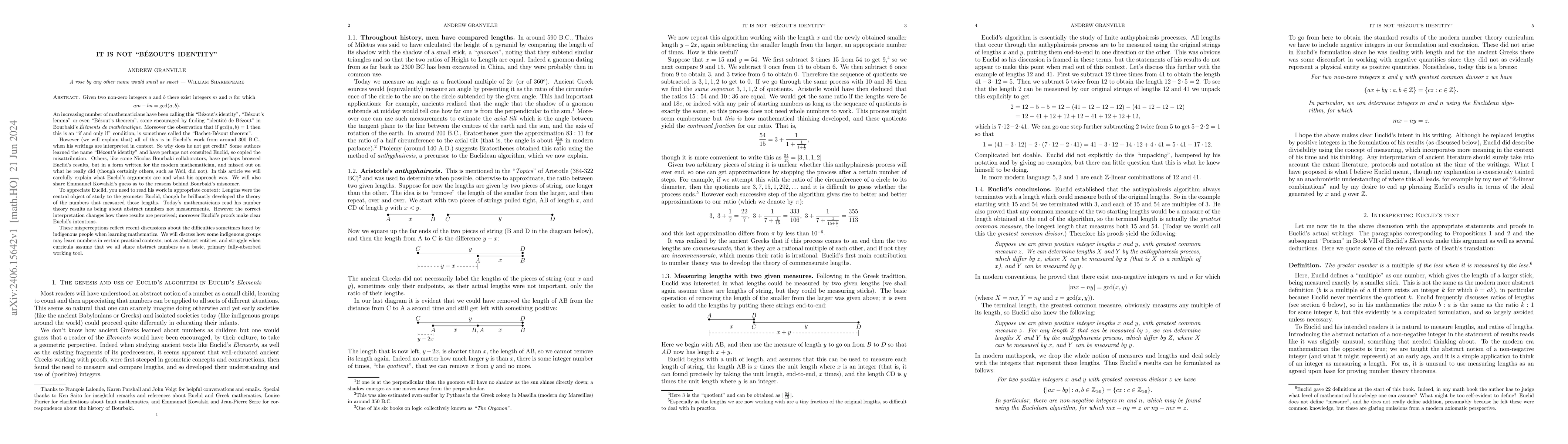 This paper argues that the equation \(am-bn = (a,b)\) is misattributed as "Bézout's identity," as it was first clearly articulated by Euclid around 300 B.C. in his work, which should be credited instead. The author also discusses how modern misinterpretations may reflect broader challenges in teaching abstract mathematics to groups unfamiliar with its conceptual framework.