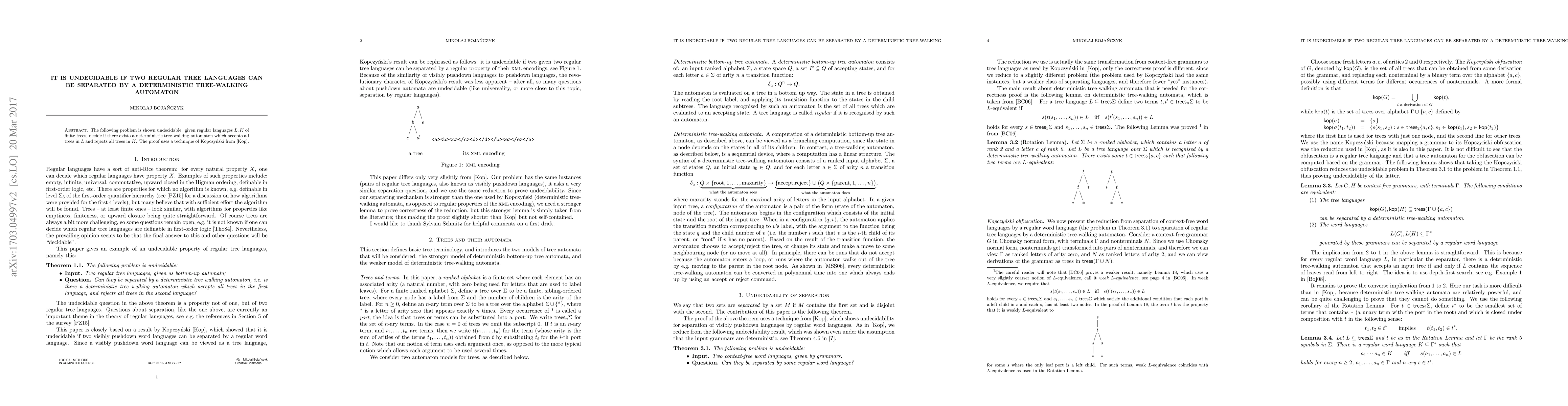 The following problem is shown undecidable: given regular languages L,K of finite trees, decide if there exists a deterministic tree-walking automaton which accepts all trees in L and rejects all trees in K. The proof uses a technique of Kopczy\'nski from LICS 2016.