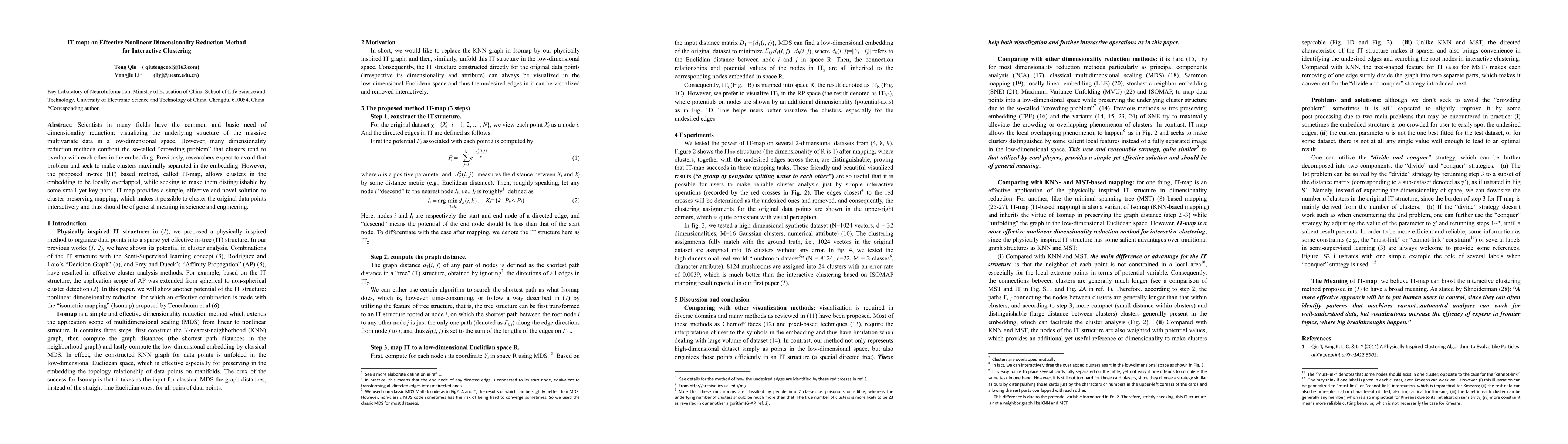 Scientists in many fields have the common and basic need of dimensionality reduction: visualizing the underlying structure of the massive multivariate data in a low-dimensional space. However, many dimensionality reduction methods confront the so-called "crowding problem" that clusters tend to overlap with each other in the embedding. Previously, researchers expect to avoid that problem and seek to make clusters maximally separated in the embedding. However, the proposed in-tree (IT) based method, called IT-map, allows clusters in the embedding to be locally overlapped, while seeking to make them distinguishable by some small yet key parts. IT-map provides a simple, effective and novel solution to cluster-preserving mapping, which makes it possible to cluster the original data points interactively and thus should be of general meaning in science and engineering.