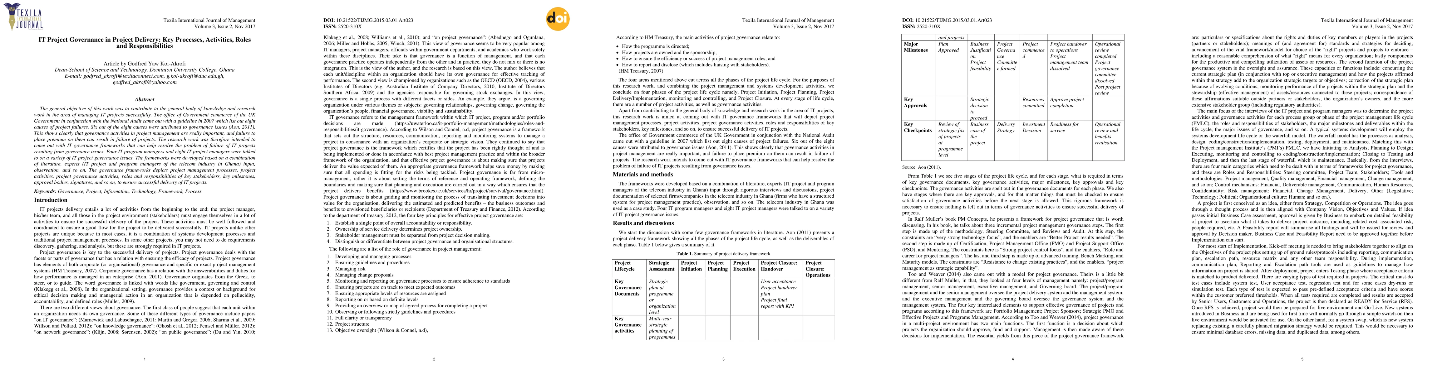 The general objective of this work was to contribute to the general body of knowledge and research work in the area of managing IT projects successfully. The office of Government commerce of the UK Government in conjunction with the National Audit came out with a guideline in 2007 which list out eight causes of project failures. Six out of the eight causes were attributed to governance issues (Aon, 2011). This shows clearly that governance activities in project management are really important, and failure to place premium on them can result in failure of projects. The research work was therefore intended to come out with IT governance frameworks that can help resolve the problem of failure of IT projects resulting from governance issues. Four IT program managers and eight IT project managers were talked to on a variety of IT project governance issues. The frameworks were developed based on a combination of literature, experts (IT project and program managers of the telecom industry in Ghana) input, observation, and so on. The governance frameworks depicts project management processes, project activities, project governance activities, roles and responsibilities of key stakeholders, key milestones, approval bodies, signatures, and so on, to ensure successful delivery of IT projects.