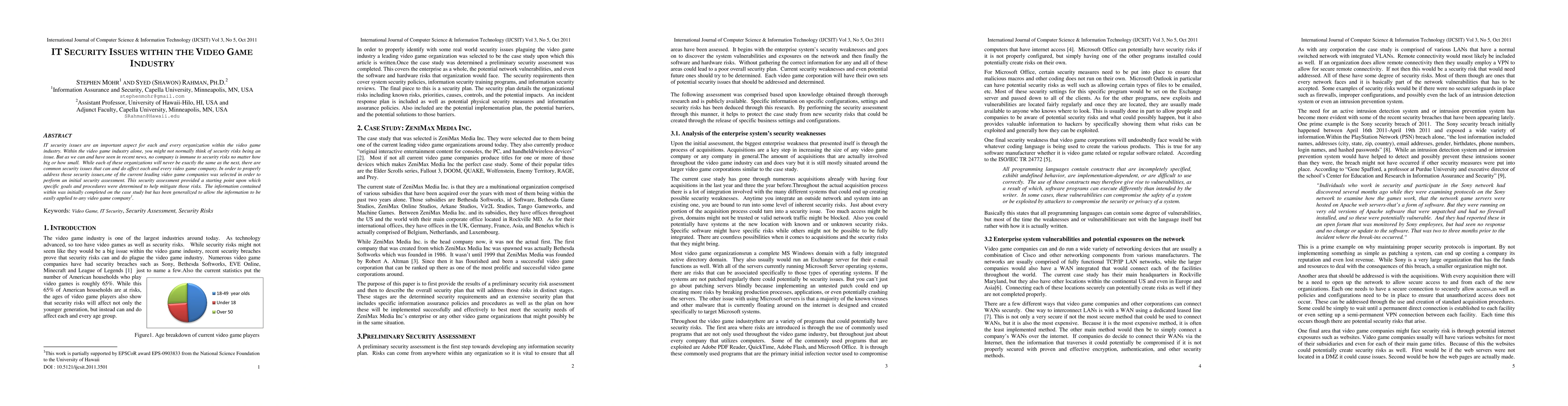 IT security issues are an important aspect for each and every organization within the video game industry. Within the video game industry alone, you might not normally think of security risks being an issue. But as we can and have seen in recent news, no company is immune to security risks no matter how big or how small. While each of these organizations will never be exactly the same as the next, there are common security issues that can and do affect each and every video game company. In order to properly address those security issues, one of the current leading video game companies was selected in order to perform an initial security assessment. This security assessment provided a starting point upon which specific goals and procedures were determined to help mitigate those risks. The information contained within was initially completed on the case study but has been generalized to allow the information to be easily applied to any video game company.