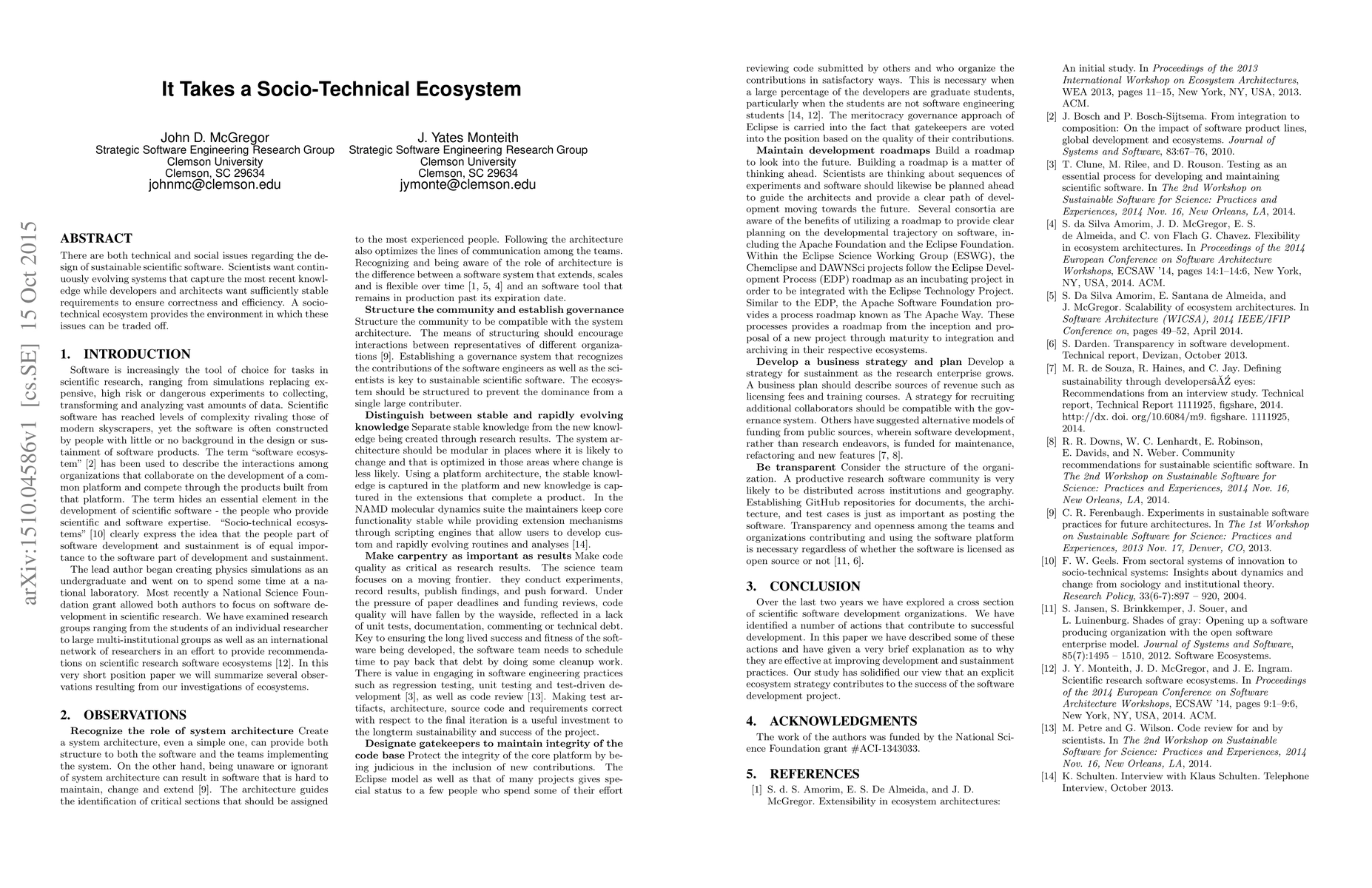 Summary: This paper discusses the need for a socio-technical ecosystem to balance the evolving demands of scientists and the stable requirements of developers in designing sustainable scientific software. It emphasizes the importance of integrating both technical and social considerations to achieve effective software solutions.