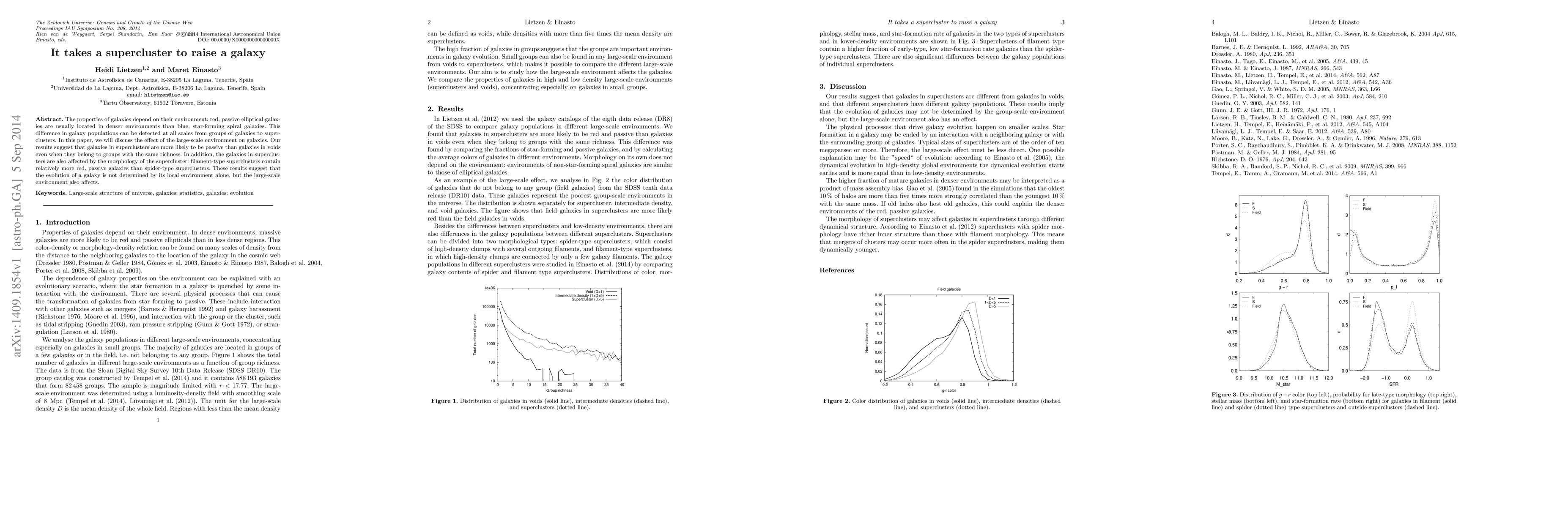 The properties of galaxies depend on their environment: red, passive elliptical galaxies are usually located in denser environments than blue, star-forming spiral galaxies. This difference in galaxy populations can be detected at all scales from groups of galaxies to superclusters. In this paper, we will discuss the effect of the large-scale environment on galaxies. Our results suggest that galaxies in superclusters are more likely to be passive than galaxies in voids even when they belong to groups with the same richness. In addition, the galaxies in superclusters are also affected by the morphology of the supercluster: filament-type superclusters contain relatively more red, passive galaxies than spider-type superclusters. These results suggest that the evolution of a galaxy is not determined by its local environment alone, but the large-scale environment also affects.