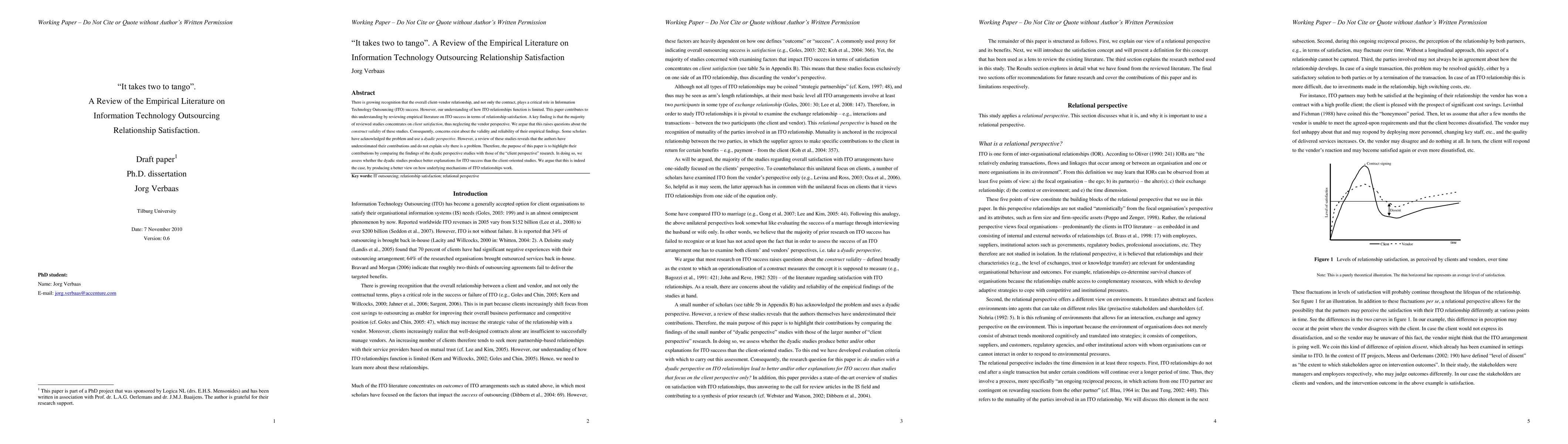 There is growing recognition that the overall client-vendor relationship, and not only the contract, plays a critical role in Information Technology Outsourcing (ITO) success. However, our understanding of how ITO relationships function is limited. This paper contributes to this understanding by reviewing empirical literature on ITO success in terms of relationship satisfaction. A key finding is that the majority of reviewed studies concentrates on client satisfaction, thus neglecting the vendor perspective. We argue that this raises questions about the construct validity of these studies. Consequently, concerns exist about the validity and reliability of their empirical findings. Some scholars have acknowledged the problem and use a dyadic perspective. However, a review of these studies reveals that the authors have underestimated their contributions and do not explain why there is a problem. Therefore, the purpose of this paper is to highlight their contributions by comparing the findings of the dyadic perspective studies with those of the "client perspective" research. In doing so, we assess whether the dyadic studies produce better explanations for ITO success than the client-oriented studies. We argue that this is indeed the case, by producing a better view on how underlying mechanisms of ITO relationships work.