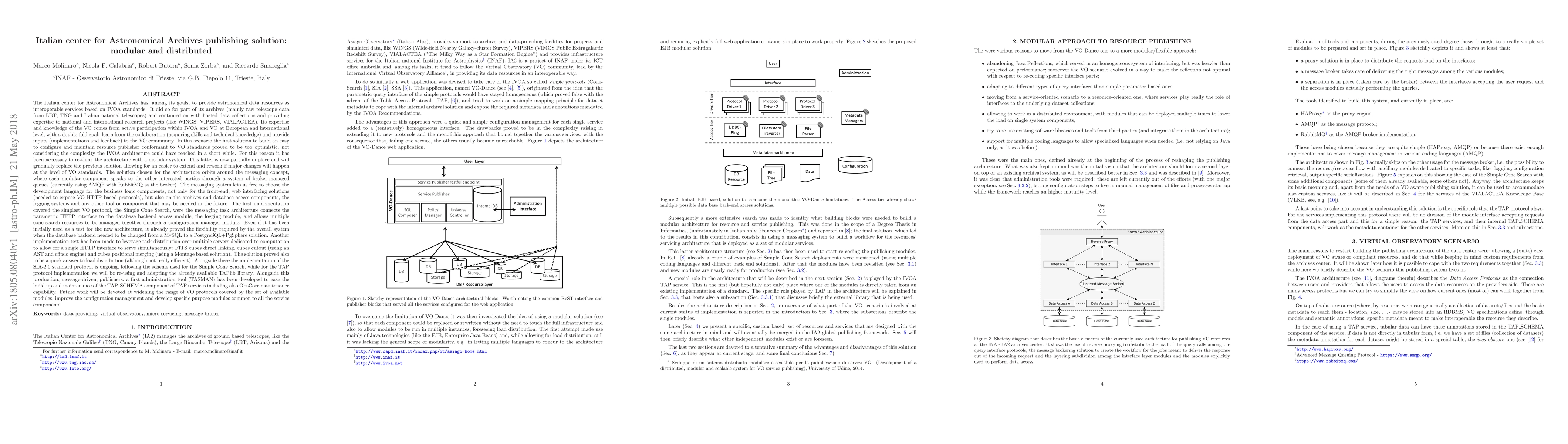 The Italian center for Astronomical Archives tries to provide astronomical data resources as interoperable services based on IVOA standards. Its VO expertise and knowledge comes from active participation within IVOA and VO at European and international level, with a double-fold goal: learn from the collaboration and provide inputs to the community. The first solution to build an easy to configure and maintain resource publisher conformant to VO standards proved to be too optimistic. For this reason it has been necessary to re-think the architecture with a modular system built around the messaging concept, where each modular component speaks to the other interested parties through a system of broker-managed queues. The first implemented protocol, the Simple Cone Search, shows the messaging task architecture connecting the parametric HTTP interface to the database backend access module, the logging module, and allows multiple cone search resources to be managed together through a configuration manager module. Even if relatively young, it already proved the flexibility required by the overall system when the database backend changed from MySQL to PostgreSQL+PgSphere. Another implementation test has been made to leverage task distribution over multiple servers to serve simultaneously: FITS cubes direct linking, cubes cutout and cubes positional merging. Currently the implementation of the SIA-2.0 standard protocol is ongoing while for TAP we will be adapting the TAPlib library. Alongside these tools a first administration tool (TASMAN) has been developed to ease the build up and maintenance of TAP_SCHEMA-ta including also ObsCore maintenance capability. Future work will be devoted at widening the range of VO protocols covered by the set of available modules, improve the configuration management and develop specific purpose modules common to all the service components.