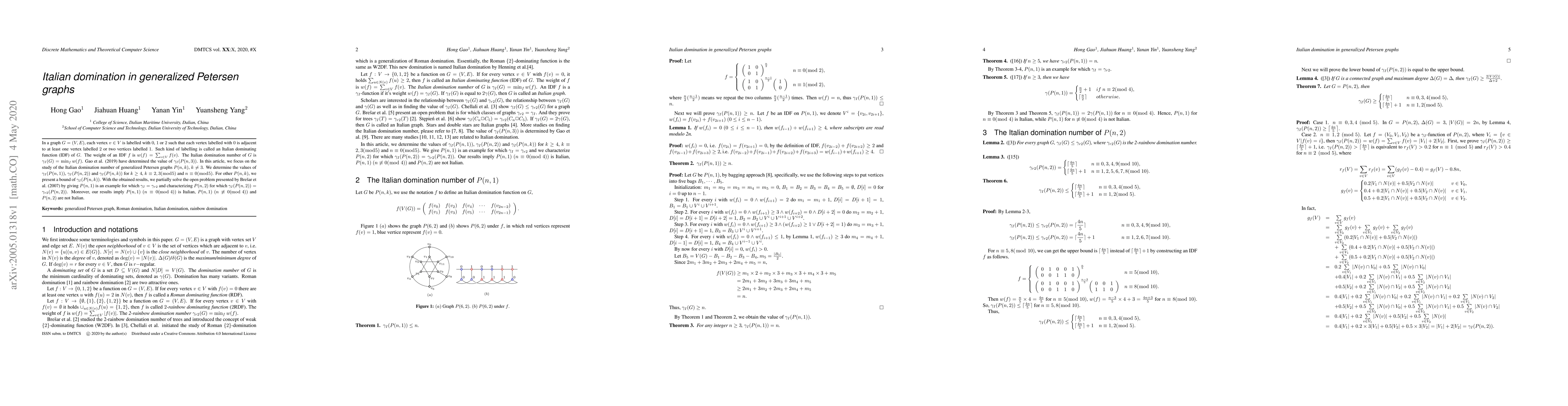 In a graph $G=(V,E)$, each vertex $v\in V$ is labelled with $0$, $1$ or $2$ such that each vertex labelled with $0$ is adjacent to at least one vertex labelled $2$ or two vertices labelled $1$. Such kind of labelling is called an Italian dominating function (IDF) of $G$. The weight of an IDF $f$ is $w(f)=\sum_{v\in V}f(v)$. The Italian domination number of $G$ is $\gamma_{I}(G)=\min_{f} w(f)$. Gao et al. (2019) have determined the value of $\gamma_I(P(n,3))$. In this article, we focus on the study of the Italian domination number of generalized Petersen graphs $P(n, k)$, $k\neq3$. We determine the values of $\gamma_I(P(n, 1))$, $\gamma_I(P(n, 2))$ and $\gamma_I(P(n, k))$ for $k\ge4$, $k\equiv2,3(\bmod5)$ and $n\equiv0(\bmod5)$. For other $P(n,k)$, we present a bound of $\gamma_I(P(n, k))$. With the obtained results, we partially solve the open problem presented by Bre\v{s}ar et al. (2007) by giving $P(n,1)$ is an example for which $\gamma_I=\gamma_{r2}$ and characterizing $P(n,2)$ for which $\gamma_I(P(n,2))=\gamma_{r2}(P(n,2))$. Moreover, our results imply $P(n,1)$ $(n\equiv0(\bmod\ 4))$ is Italian, $P(n,1)$ $(n\not\equiv0(\bmod\ 4))$ and $P(n,2)$ are not Italian.