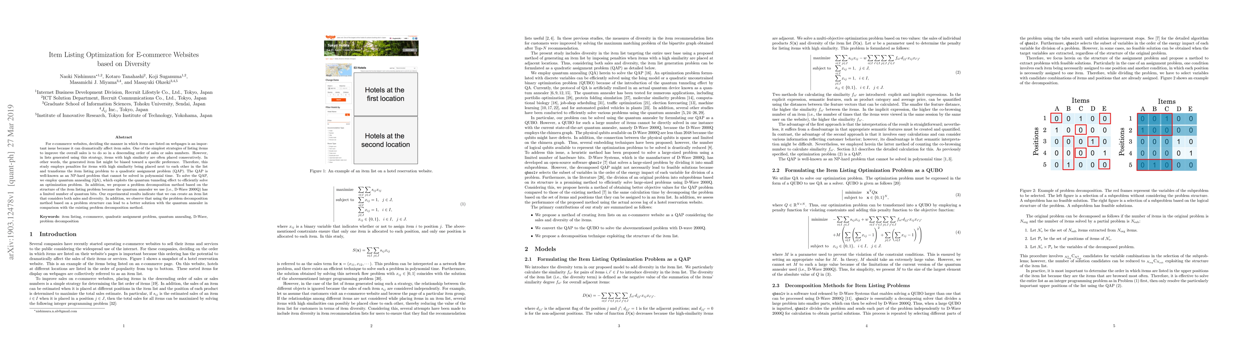 This study uses quantum annealing to optimize item listing for e-commerce websites, balancing sales and diversity, and outperforms existing methods with a problem decomposition approach.
