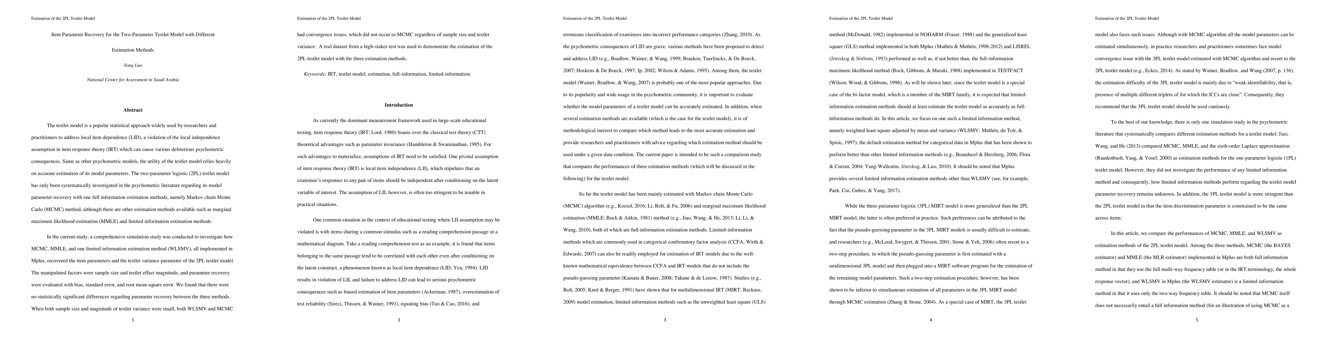 The testlet model is a popular statistical approach widely used by researchers and practitioners to address local item dependence (LID), a violation of the local independence assumption in item response theory (IRT) which can cause various deleterious psychometric consequences. Same as other psychometric models, the utility of the testlet model relies heavily on accurate estimation of its model parameters. The two-parameter logistic (2PL) testlet model has only been systematically investigated in the psychometric literature regarding its model parameter recovery with one full information estimation methods, namely Markov chain Monte Carlo (MCMC) method, although there are other estimation methods available such as marginal maximum likelihood estimation (MMLE) and limited information estimation methods. In the current study, a comprehensive simulation study was conducted to investigate how MCMC, MMLE, and one limited information estimation method (WLSMV), all implemented in Mplus, recovered the item parameters and the testlet variance parameter of the 2PL testlet model. The manipulated factors were sample size and testlet effect magnitude, and parameter recovery were evaluated with bias, standard error, and root mean square error. We found that there were no statistically significant differences regarding parameter recovery between the three methods. When both sample size and magnitude of testlet variance were small, both WLSMV and MCMC had convergence issues, which did not occur to MCMC regardless of sample size and testlet variance. A real dataset from a high-stakes test was used to demonstrate the estimation of the 2PL testlet model with the three estimation methods. Keywords: IRT, testlet model, estimation, full-information, limited-information.