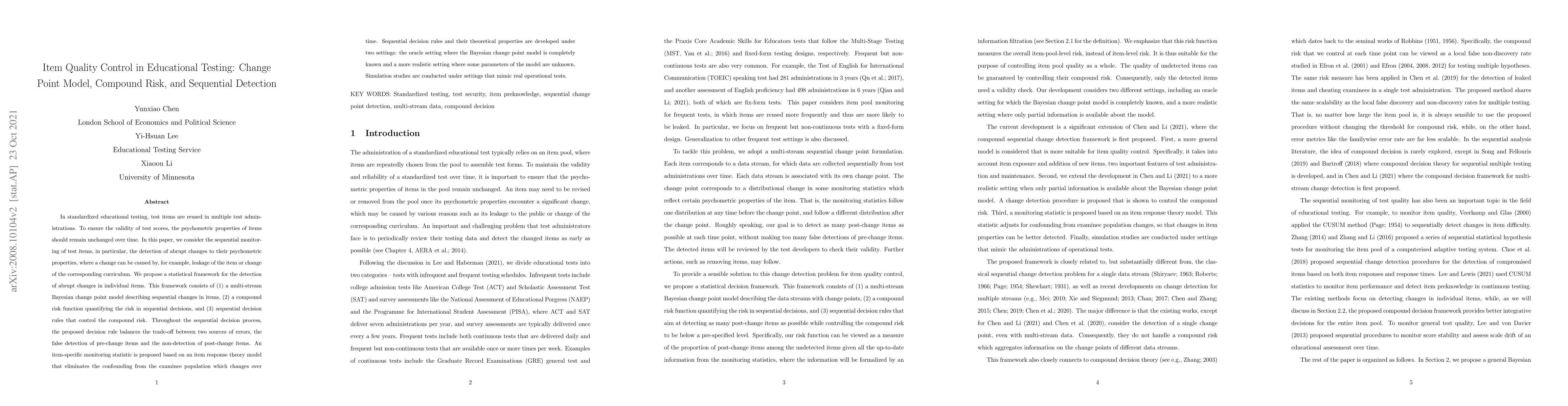 This paper proposes a statistical framework for detecting abrupt changes in the psychometric properties of reused test items in educational testing. The framework includes a multi-stream Bayesian change point model, a compound risk function, and sequential decision rules to balance error trade-offs, ensuring the validity of test scores over time. Simulation studies validate the framework under both ideal and realistic conditions.