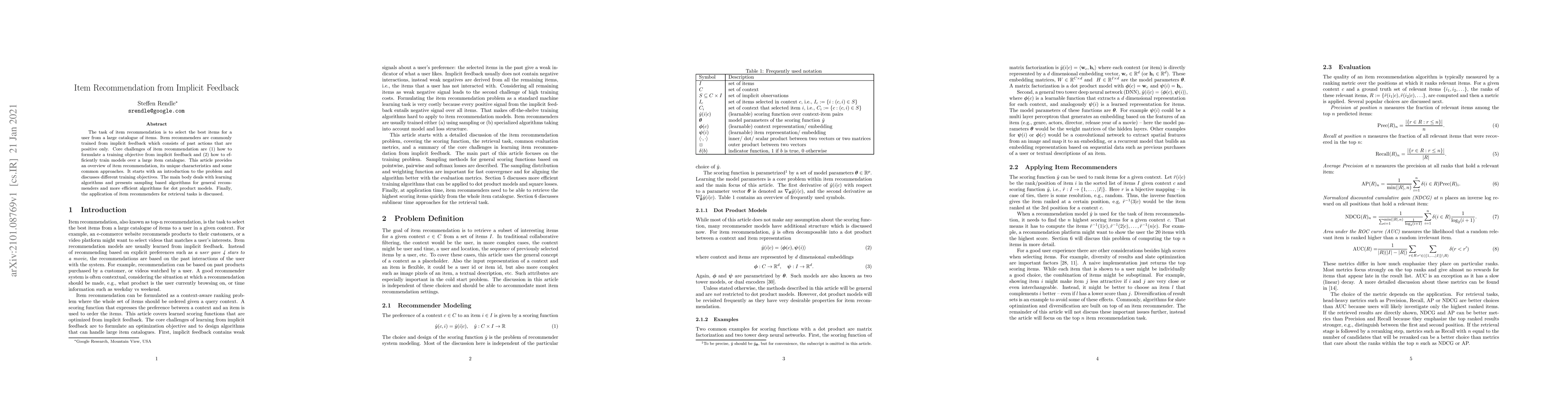 This paper reviews item recommendation from implicit feedback, focusing on training objectives and efficient model training over large item catalogues. It discusses various learning algorithms, including sampling-based and dot product models, and explores their application in retrieval tasks.