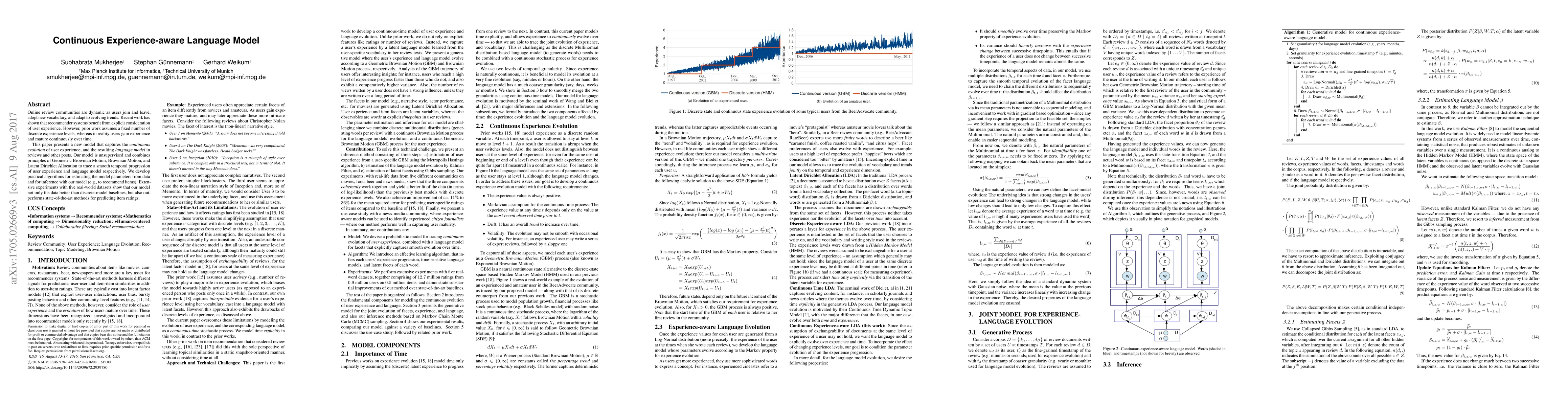 This paper proposes a new model that captures continuous user experience evolution using Geometric Brownian Motion, outperforming baseline models and state-of-the-art methods in item rating predictions.