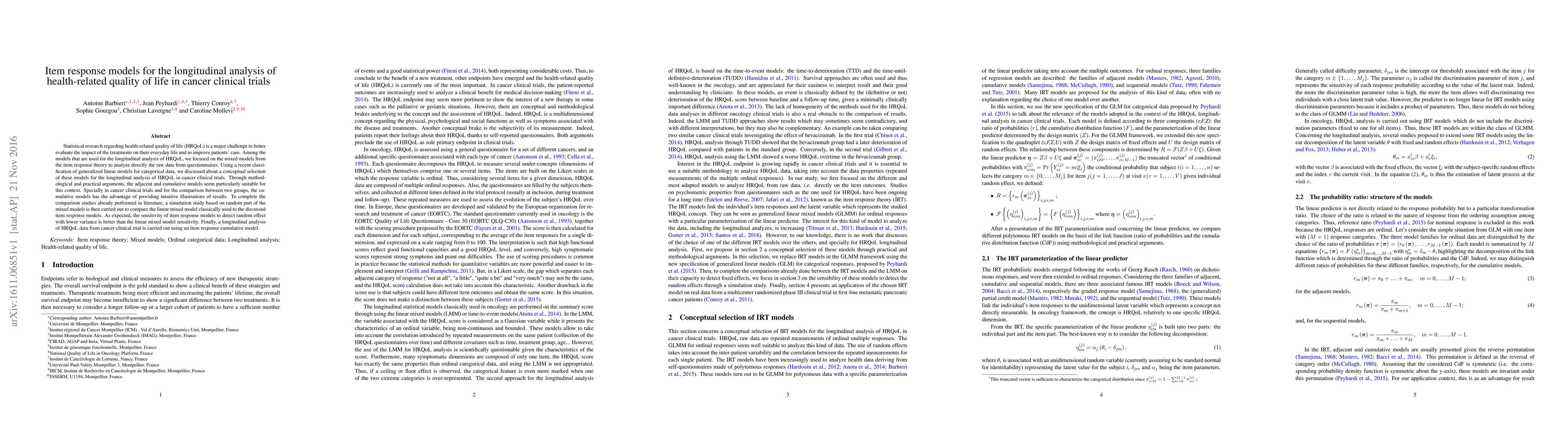 Statistical research regarding health-related quality of life (HRQoL) is a major challenge to better evaluate the impact of the treatments on their everyday life and to improve patients' care. Among the models that are used for the longitudinal analysis of HRQoL, we focused on the mixed models from the item response theory to analyze directly the raw data from questionnaires. Using a recent classification of generalized linear models for categorical data, we discussed about a conceptual selection of these models for the longitudinal analysis of HRQoL in cancer clinical trials. Through methodological and practical arguments, the adjacent and cumulative models seem particularly suitable for this {context}. Specially in cancer clinical trials and for the comparison between two groups, the cumulative models has the advantage of providing intuitive illustrations of results. To complete the comparison studies already performed in literature, a simulation study based on random part of the mixed models is then carried out to compare the linear mixed model classically used to the discussed item response models. As expected, the sensitivity of item response models to detect random effect with lower variance is better than the linear mixed model sensitivity. Finally, a longitudinal analysis of HRQoL data from cancer clinical trial is carried out using an item response cumulative model.