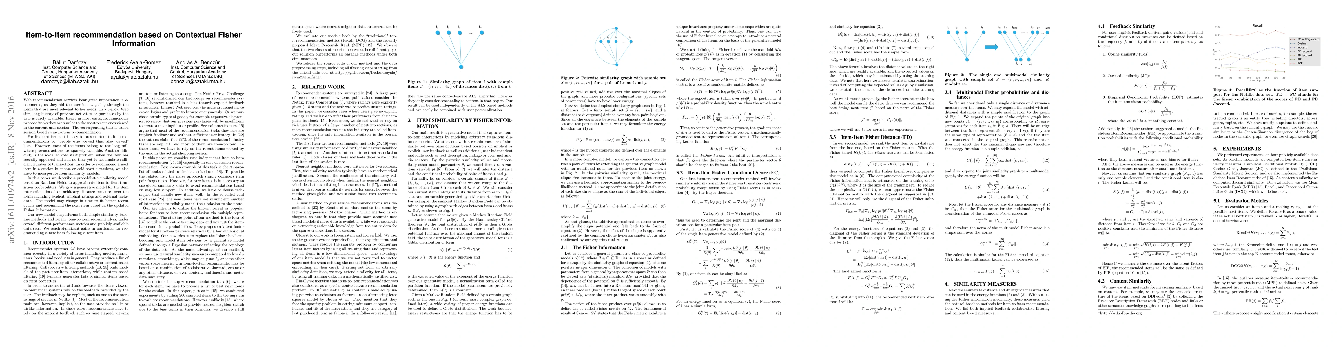 Web recommendation services bear great importance in e-commerce, as they aid the user in navigating through the items that are most relevant to her needs. In a typical Web site, long history of previous activities or purchases by the user is rarely available. Hence in most cases, recommenders propose items that are similar to the most recent ones viewed in the current user session. The corresponding task is called session based item-to-item recommendation. For frequent items, it is easy to present item-to-item recommendations by "people who viewed this, also viewed" lists. However, most of the items belong to the long tail, where previous actions are sparsely available. Another difficulty is the so-called cold start problem, when the item has recently appeared and had no time yet to accumulate sufficient number of transactions. In order to recommend a next item in a session in sparse or cold start situations, we also have to incorporate item similarity models. In this paper we describe a probabilistic similarity model based on Random Fields to approximate item-to-item transition probabilities. We give a generative model for the item interactions based on arbitrary distance measures over the items including explicit, implicit ratings and external metadata. The model may change in time to fit better recent events and recommend the next item based on the updated Fisher Information. Our new model outperforms both simple similarity baseline methods and recent item-to-item recommenders, under several different performance metrics and publicly available data sets. We reach significant gains in particular for recommending a new item following a rare item.