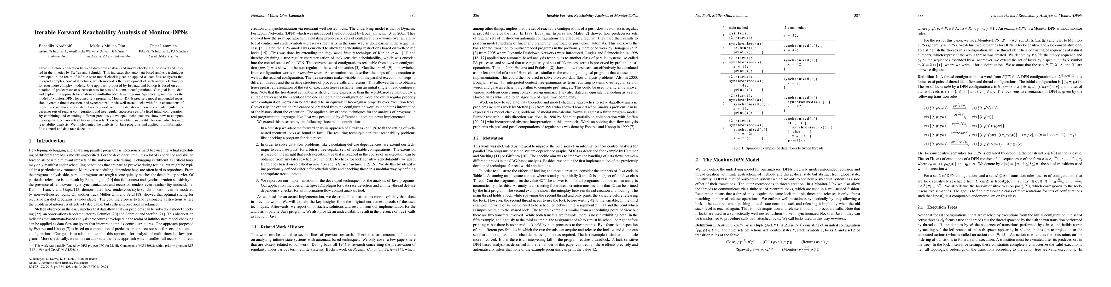 There is a close connection between data-flow analysis and model checking as observed and studied in the nineties by Steffen and Schmidt. This indicates that automata-based analysis techniques developed in the realm of infinite-state model checking can be applied as data-flow analyzers that interpret complex control structures, which motivates the development of such analysis techniques for ever more complex models. One approach proposed by Esparza and Knoop is based on computation of predecessor or successor sets for sets of automata configurations. Our goal is to adapt and exploit this approach for analysis of multi-threaded Java programs. Specifically, we consider the model of Monitor-DPNs for concurrent programs. Monitor-DPNs precisely model unbounded recursion, dynamic thread creation, and synchronization via well-nested locks with finite abstractions of procedure- and thread-local state. Previous work on this model showed how to compute regular predecessor sets of regular configurations and tree-regular successor sets of a fixed initial configuration. By combining and extending different previously developed techniques we show how to compute tree-regular successor sets of tree-regular sets. Thereby we obtain an iterable, lock-sensitive forward reachability analysis. We implemented the analysis for Java programs and applied it to information flow control and data race detection.