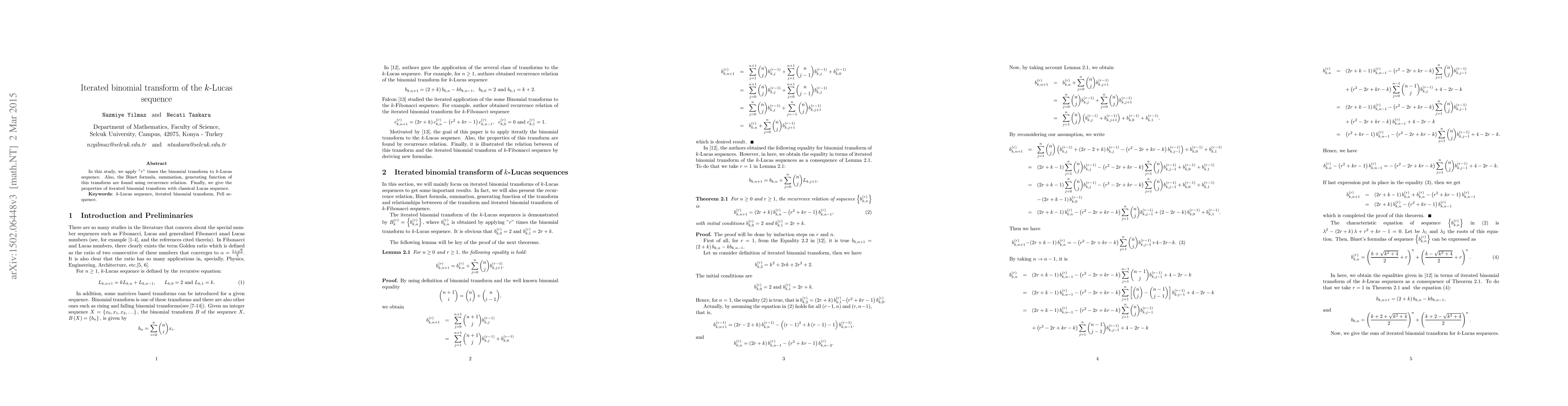 This paper investigates the application of "r" iterations of the binomial transform to the k-Lucas sequence, deriving the Binet formula, summation, and generating function through recurrence relations, and explores the properties of this transform when applied to classical Lucas sequences.