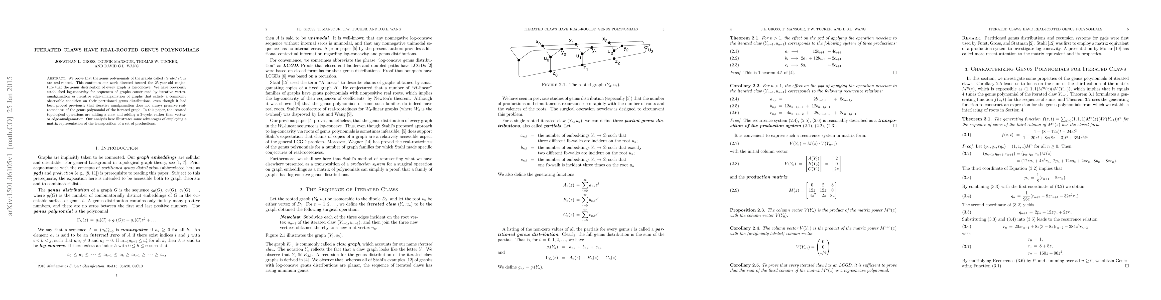 This paper demonstrates that the genus polynomials of iterated claw graphs are real-rooted, advancing research toward the conjecture that all graph genus distributions are log-concave. The authors explore new topological operations, showing advantages in matrix representations for their analysis.