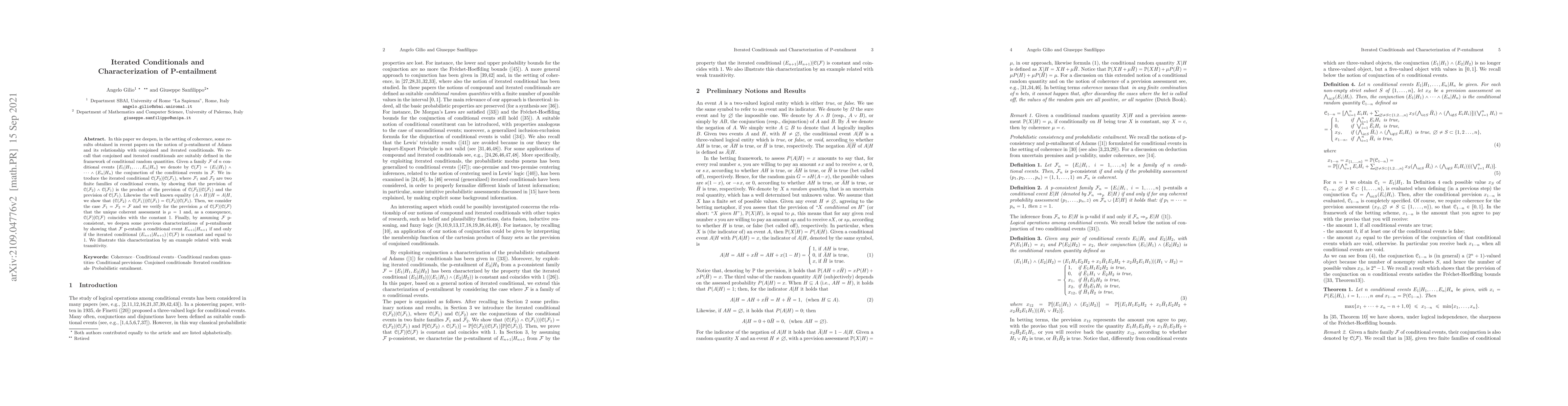 This paper explores the concept of p-entailment within coherence frameworks, focusing on conjoined and iterated conditionals defined via conditional random quantities. It establishes that the iterated conditional $\mathscr{C}(\mathcal{F}_2)|\mathscr{C}(\mathcal{F}_1)$ maintains a specific prevision relationship, and it characterizes p-entailment through the constant value of iterated conditionals.