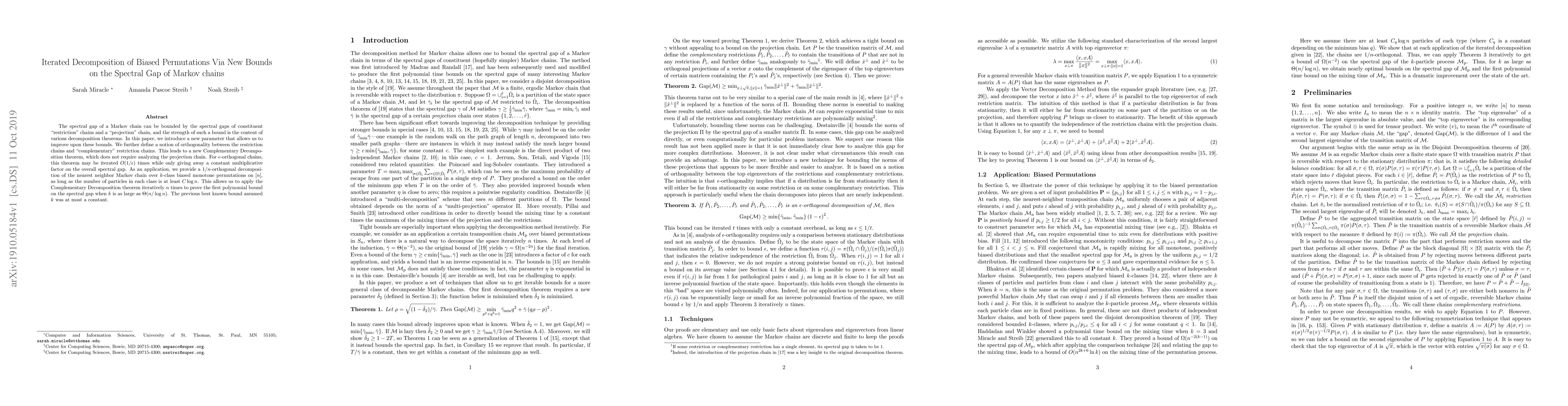 This paper introduces a new parameter to improve bounds on the spectral gap of Markov chains through a Complementary Decomposition theorem, which avoids analyzing the projection chain. It applies this to biased permutations, achieving the first polynomial spectral gap bound for large $k$ values, previously limited to constants.