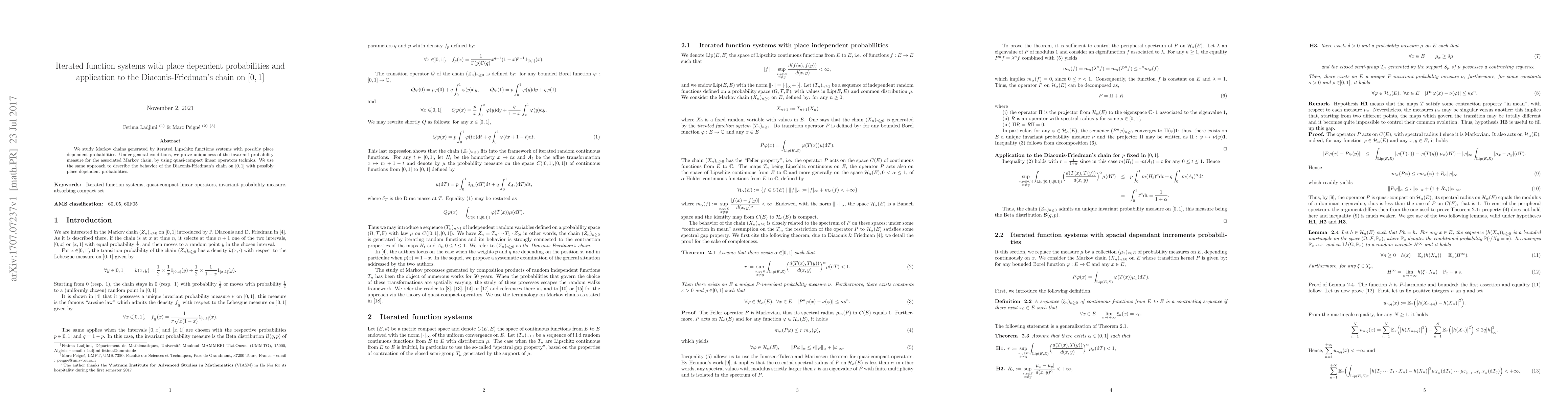 We study Markov chains generated by iterated Lipschitz functions systems with possibly place dependent probabilities. Under general conditions, we prove uniqueness of the invariant probability measure for the associated Markov chain, by using quasi-compact linear operators technics. We use the same approach to describe the behavior of the Diaconis-Friedman's chain on [0,1] with possibly place dependent probabilities.