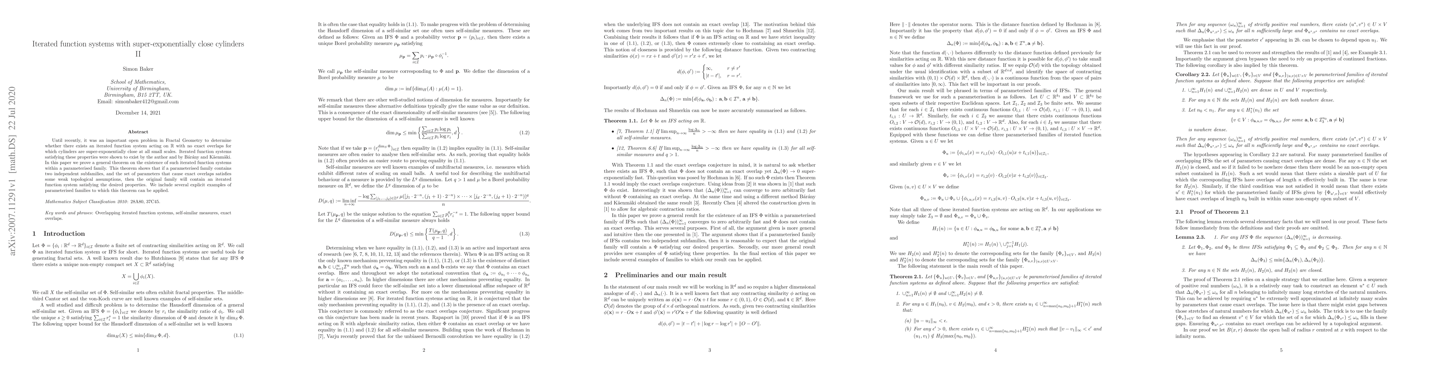 This paper proves the existence of iterated function systems on $\mathbb{R}$ with no exact overlaps, where cylinders are super-exponentially close at small scales. The authors demonstrate a general theorem applicable to parameterised families containing two independent subfamilies, provided certain topological conditions are met.