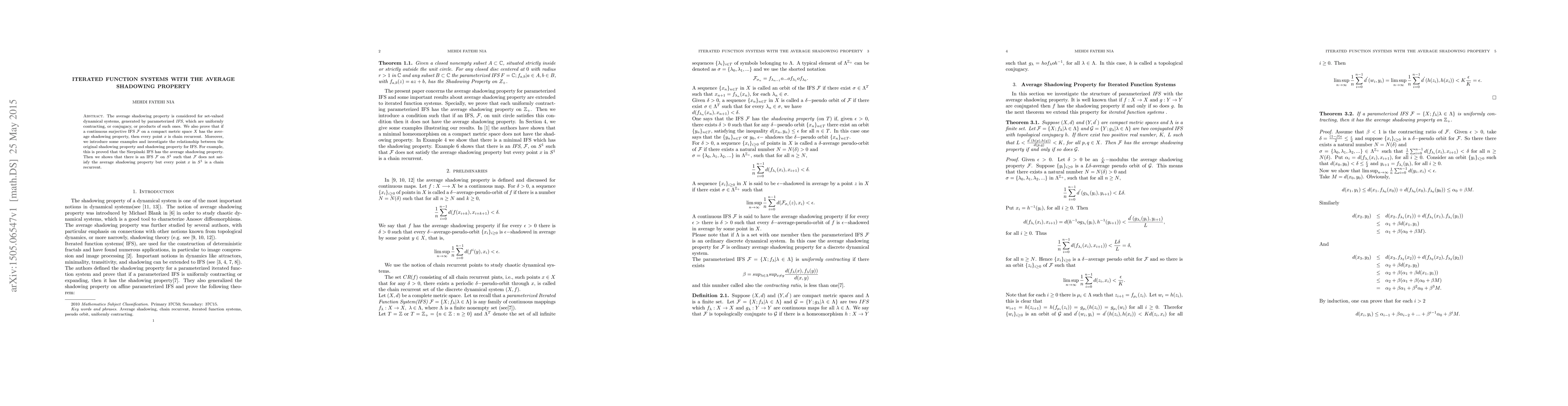 The average shadowing property is considered for set-valued dynamical systems, generated by parameterized IFS, which are uniformly contracting, or conjugacy, or products of such ones. We also prove that if a continuous surjective IFS F on a compact metric space X has the aver- age shadowing property, then every point x is chain recurrent. Moreover, we introduce some examples and investigate the relationship between the original shadowing property and shadowing property for IFS. For example, this is proved that the Sierpinski IFS has the average shadowing property. Then we shows that there is an IFS F on S1 such that F does not sat- isfy the average shadowing property but every point x in S1 is a chain recurrent.