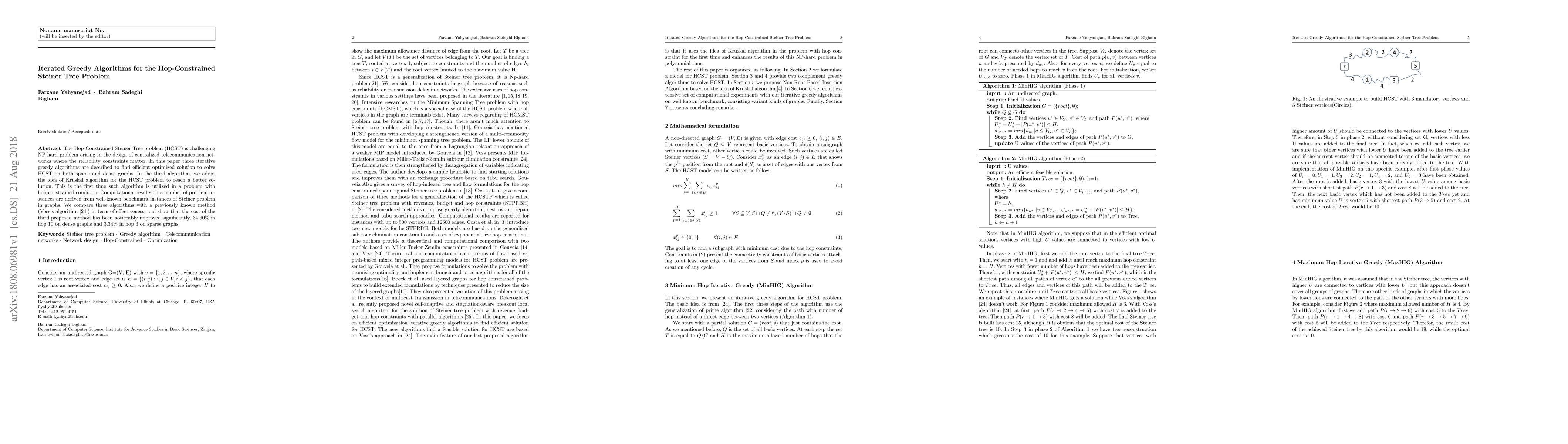 This paper proposes three iterative greedy algorithms for the NP-hard Hop-Constrained Steiner Tree problem, focusing on optimizing solutions for both sparse and dense graphs. The third algorithm, inspired by Kruskal's algorithm, notably improves performance, achieving a 34.60% reduction in cost on dense graphs and a 3.34% reduction on sparse graphs compared to Voss's algorithm.