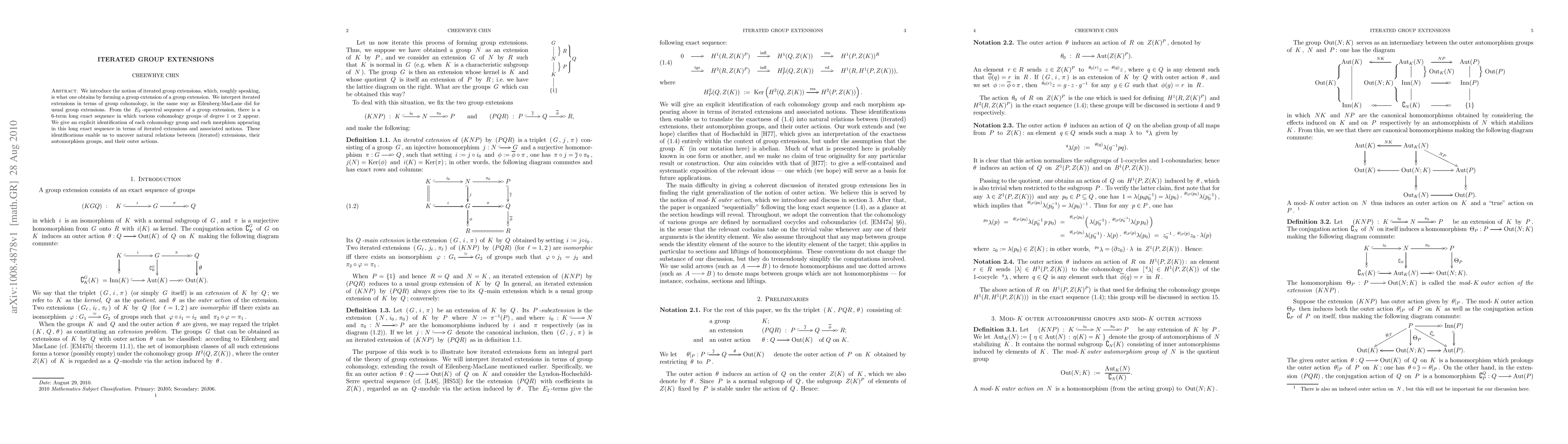 This paper introduces iterated group extensions and interprets them using group cohomology, revealing a 6-term exact sequence involving degree 1 and 2 cohomology groups. It explicitly identifies these cohomology groups and morphisms in terms of iterated extensions, uncovering natural relations between extensions, their automorphism groups, and outer actions.