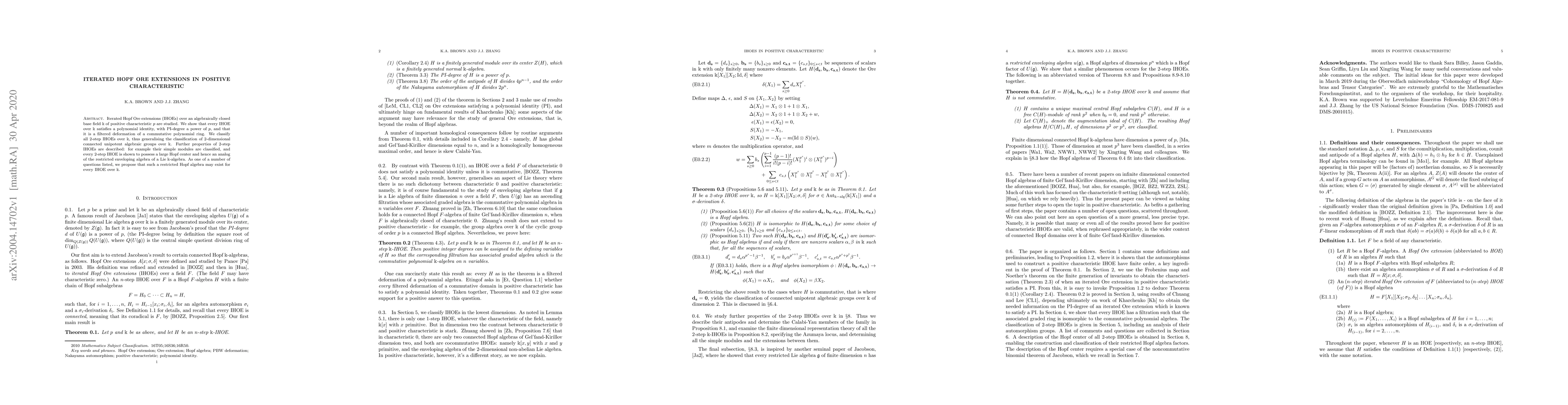 Iterated Hopf Ore extensions (IHOEs) over an algebraically closed base field k of positive characteristic p are studied. We show that every IHOE over k satisfies a polynomial identity, with PI-degree a power of p, and that it is a filtered deformation of a commutative polynomial ring. We classify all 2-step IHOEs over k, thus generalising the classification of 2-dimensional connected unipotent algebraic groups over k. Further properties of 2-step IHOEs are described: for example their simple modules are classified, and every 2-step IHOE is shown to possess a large Hopf center and hence an analog of the restricted enveloping algebra of a Lie k-algebra. As one of a number of questions listed, we propose that such a restricted Hopf algebra may exist for every IHOE over k.