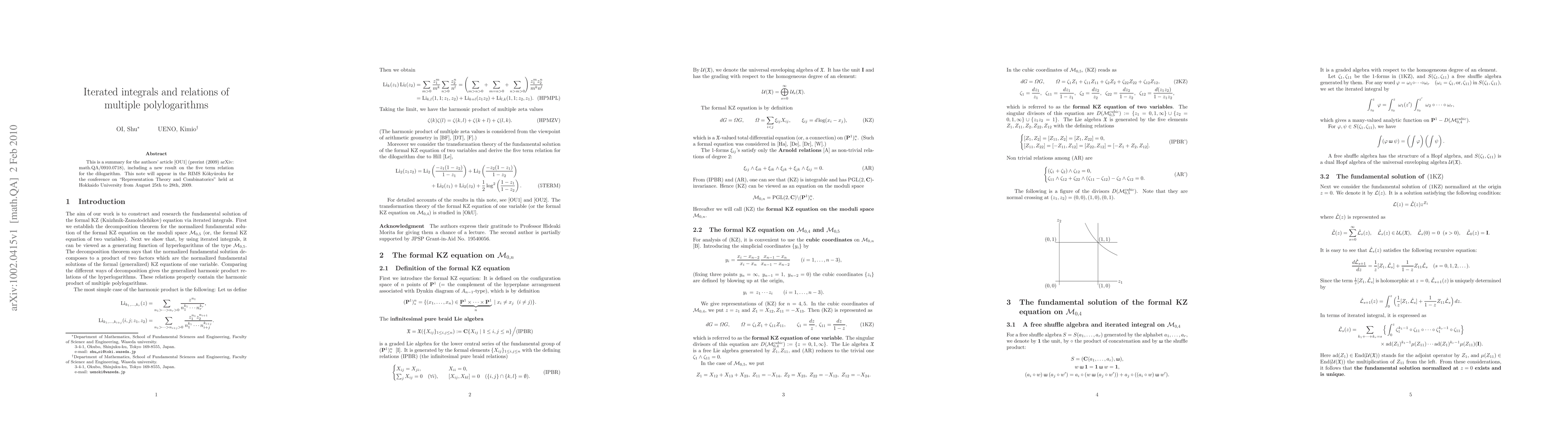 The paper explores the formal KZ equation on moduli space ${\mathcal M}_{0,5}$ and its connection to multiple zeta values, presenting a new five-term relation for the dilogarithm. This research contributes to understanding iterated integrals and their relations in multiple polylogarithms.