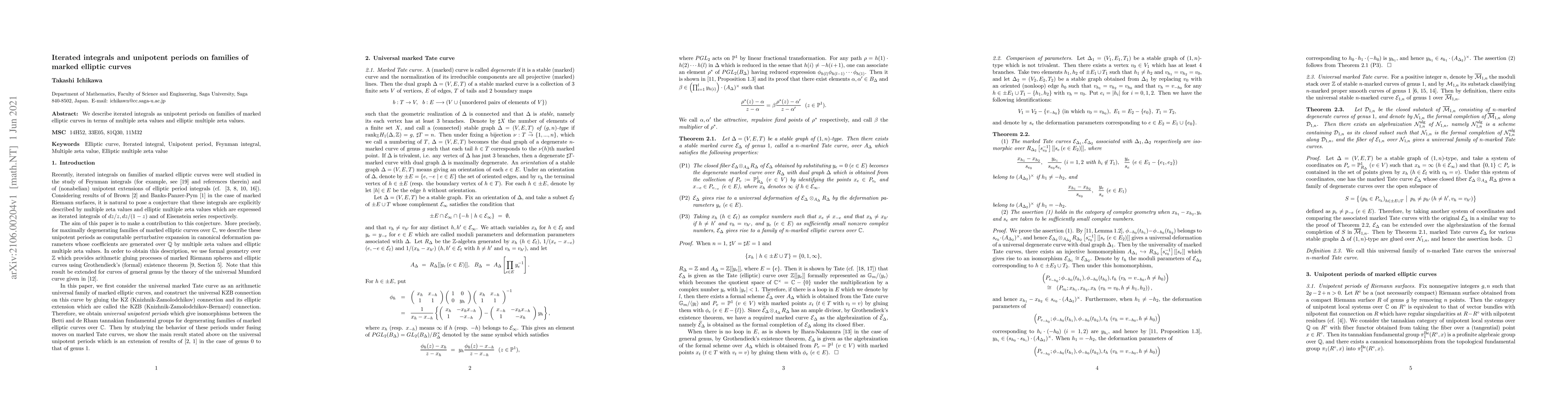 Summary: The paper explores iterated integrals on families of marked elliptic curves, expressing them as unipotent periods in terms of multiple zeta values and elliptic multiple zeta values. This provides a novel perspective on the mathematical structures involved.