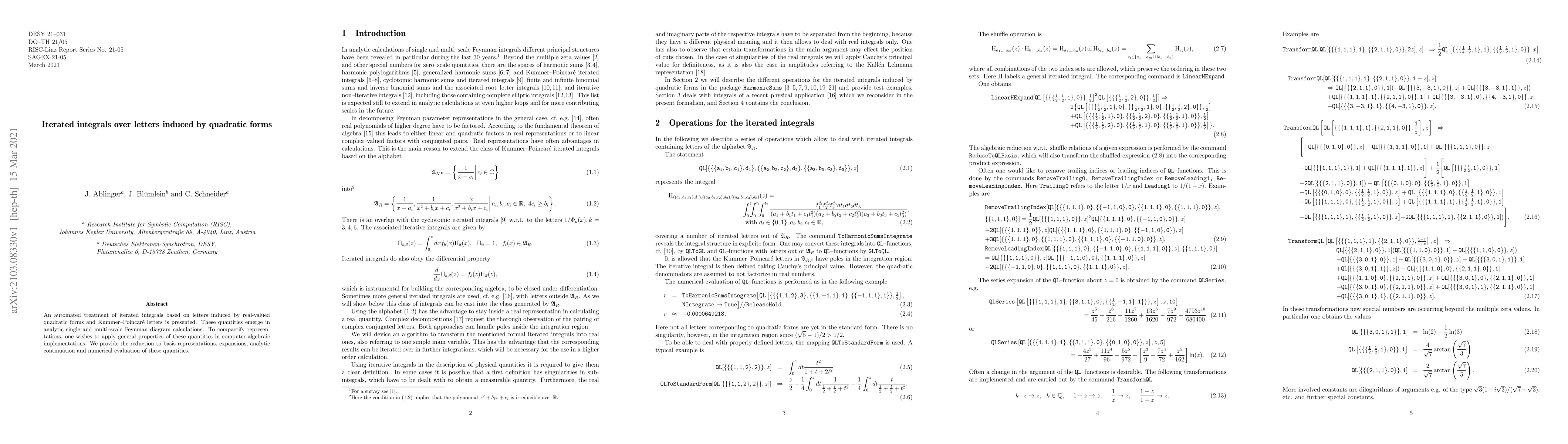 An automated treatment of iterated integrals based on letters induced by real-valued quadratic forms and Kummer--Poincar\'e letters is presented. These quantities emerge in analytic single and multi--scale Feynman diagram calculations. To compactify representations, one wishes to apply general properties of these quantities in computer-algebraic implementations. We provide the reduction to basis representations, expansions, analytic continuation and numerical evaluation of these quantities.