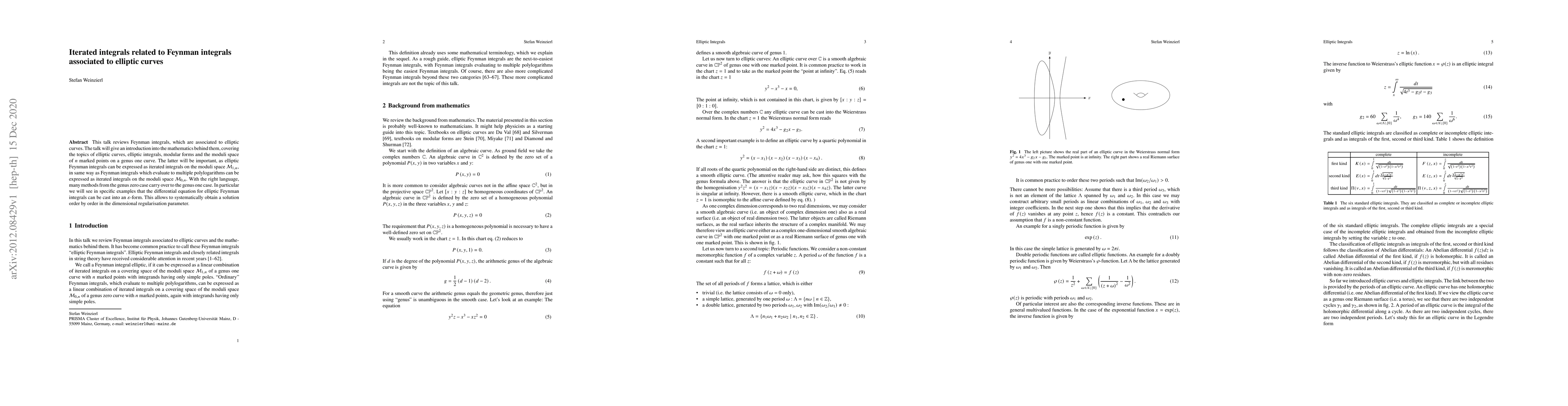 This talk reviews Feynman integrals, which are associated to elliptic curves. The talk will give an introduction into the mathematics behind them, covering the topics of elliptic curves, elliptic integrals, modular forms and the moduli space of $n$ marked points on a genus one curve. The latter will be important, as elliptic Feynman integrals can be expressed as iterated integrals on the moduli space ${\mathcal M}_{1,n}$, in same way as Feynman integrals which evaluate to multiple polylogarithms can be expressed as iterated integrals on the moduli space ${\mathcal M}_{0,n}$. With the right language, many methods from the genus zero case carry over to the genus one case. In particular we will see in specific examples that the differential equation for elliptic Feynman integrals can be cast into an $\varepsilon$-form. This allows to systematically obtain a solution order by order in the dimensional regularisation parameter.