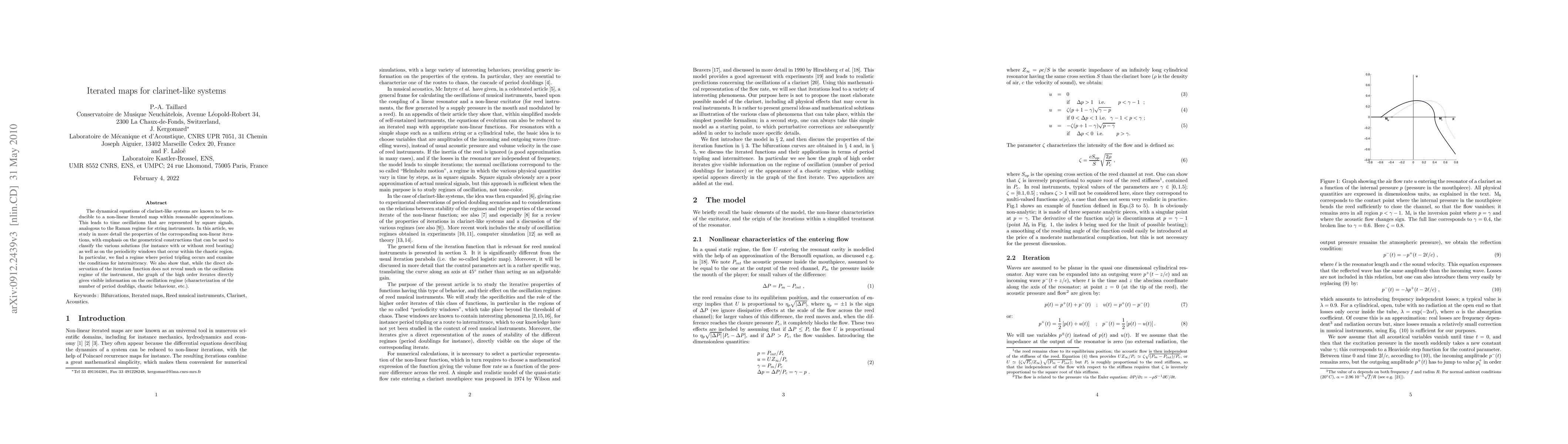 The dynamical equations of clarinet-like systems are known to be reducible to a non-linear iterated map within reasonable approximations. This leads to time oscillations that are represented by square signals, analogous to the Raman regime for string instruments. In this article, we study in more detail the properties of the corresponding non-linear iterations, with emphasis on the geometrical constructions that can be used to classify the various solutions (for instance with or without reed beating) as well as on the periodicity windows that occur within the chaotic region. In particular, we find a regime where period tripling occurs and examine the conditions for intermittency. We also show that, while the direct observation of the iteration function does not reveal much on the oscillation regime of the instrument, the graph of the high order iterates directly gives visible information on the oscillation regime (characterization of the number of period doubligs, chaotic behaviour, etc.).