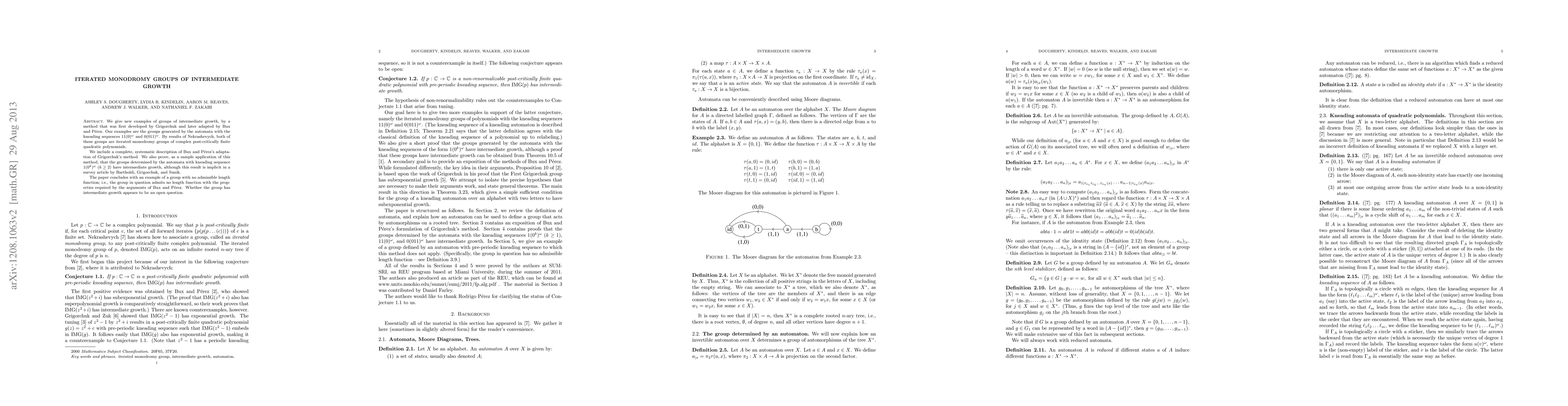 We give two new examples of groups of intermediate growth, by a method that was first used by Bux and P\'erez. Our examples are the groups generated by the automata with the kneading sequences 11(0) and 0(011). By results of Nekrashevych, both of these groups are iterated monodromy groups of complex post-critically finite quadratic polynomials. We include a complete, systematic description of the Bux-P\'erez method. We also prove, as a sample application of the method, that the groups determined by the automata with kneading sequence 1(0^k) (k >= 2) have intermediate growth, although this result is implicit in a survey article by Bartholdi, Grigorchuk, and Sunik. The paper concludes with an example of a group with no admissible length function; i.e., the group in question admits no length function with the properties required by the Bux-P\'erez method. Whether the group has intermediate growth appears to be an open question.
