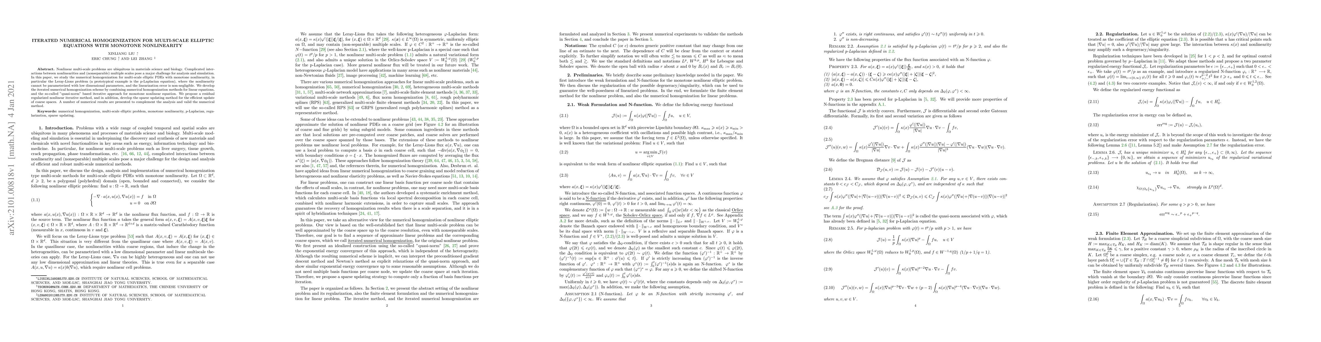 This paper develops an iterated numerical homogenization scheme for solving multi-scale elliptic PDEs with monotone nonlinearity, specifically addressing the Leray-Lions problem. It combines linear homogenization methods with a quasi-norm based iterative approach to handle the nonlinearity, and introduces a residual regularized nonlinear iterative method for efficient computation.