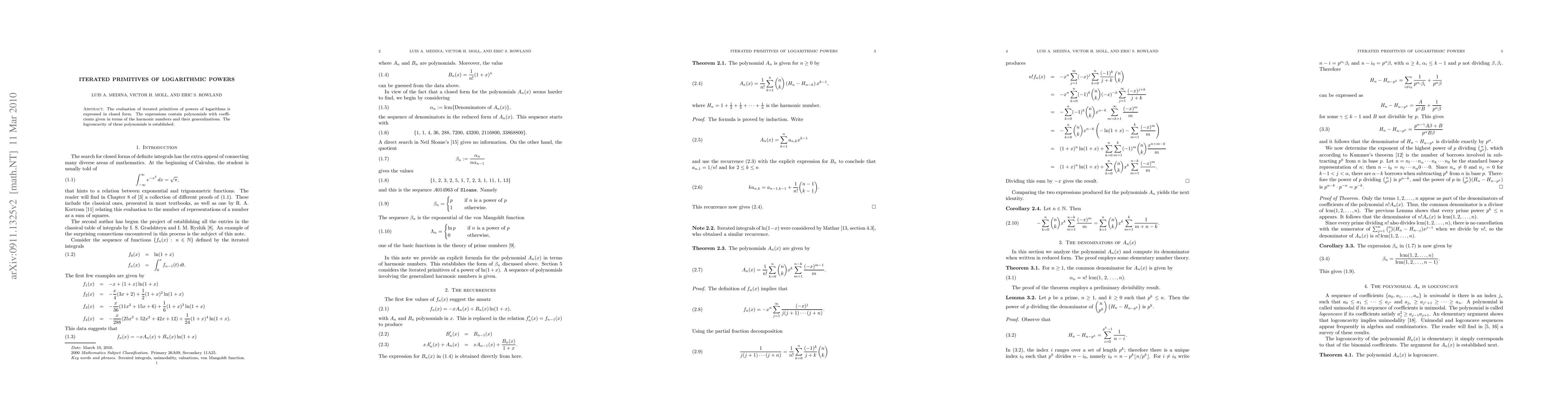 The evaluation of iterated primitives of powers of logarithms is expressed in closed form. The expressions contain polynomials with coefficients given in terms of the harmonic numbers and their generalizations. The logconcavity of these polynomials is established.