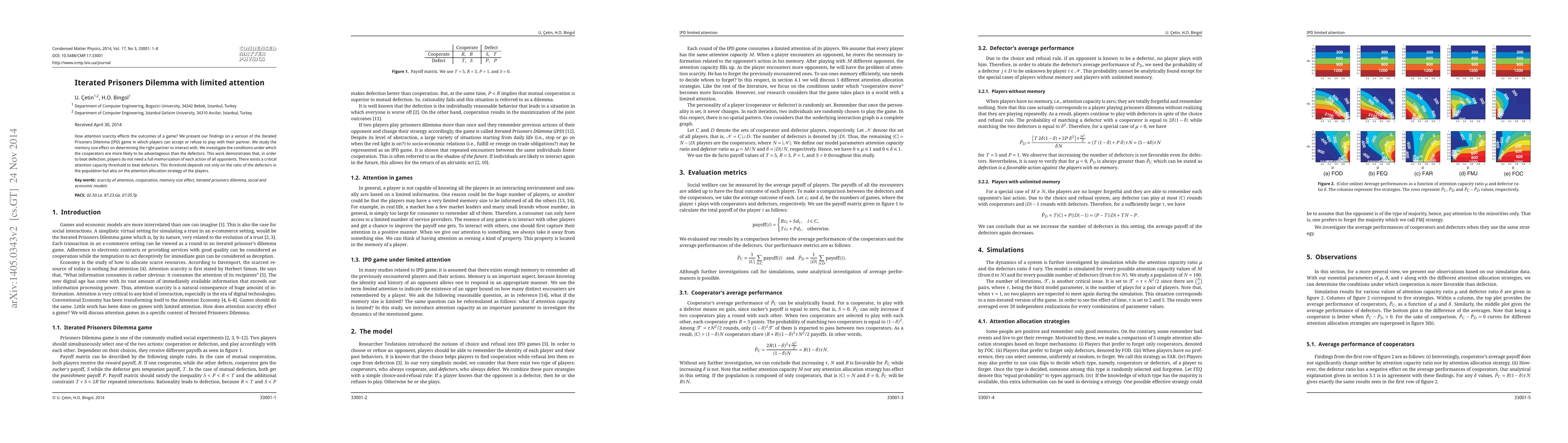 This paper explores how limited attention affects outcomes in the Iterated Prisoners Dilemma, showing that players can outperform defectors without memorizing all opponents' actions. It identifies a critical threshold for attention capacity that depends on the defector ratio and players' attention strategies.
